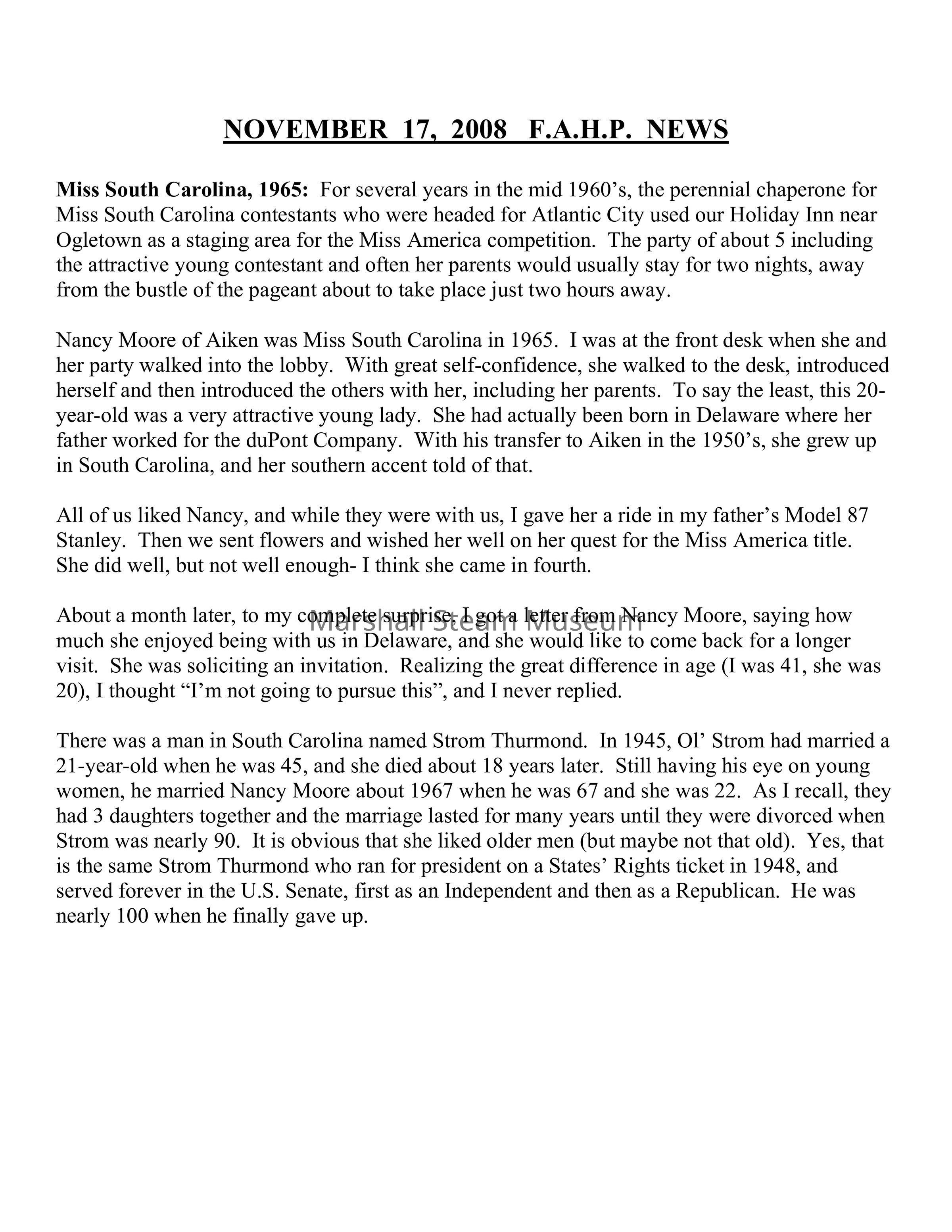 All of us liked Nancy, and while they were with us, I gave her a ride in my father’s Model 87 Stanley. Then we sent flowers and wished her well on her quest for the Miss America title. She did well, but not well enough- I think she came in fourth.