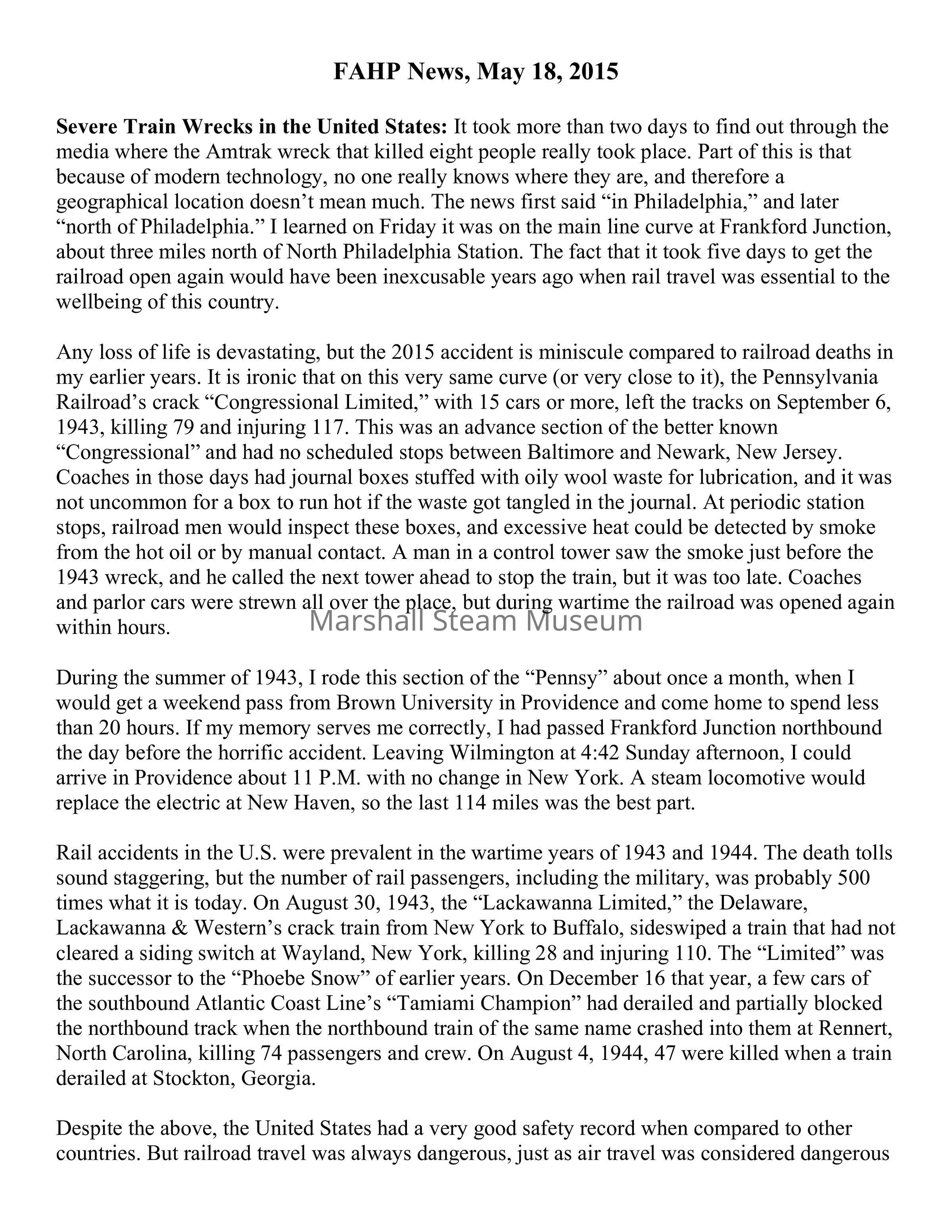 Any loss of life is devastating, but the 2015 accident is miniscule compared to railroad deaths in my earlier years. It is ironic that on this very same curve (or very close to it), the Pennsylvania Railroad’s crack “Congressional Limited,” with 15 cars or more, left the tracks on September 6, 1943, killing 79 and injuring 117. This was an advance section of the better known “Congressional” and had no scheduled stops between Baltimore and Newark, New Jersey. Coaches in those days had journal boxes stuffed with oily wool waste for lubrication, and it was not uncommon for a box to run hot if the waste got tangled in the journal. At periodic station stops, railroad men would inspect these boxes, and excessive heat could be detected by smoke from the hot oil or by manual contact. A man in a control tower saw the smoke just before the 1943 wreck, and he called the next tower ahead to stop the train, but it was too late. Coaches and parlor cars were strewn all over the place, but during wartime the railroad was opened again within hours.