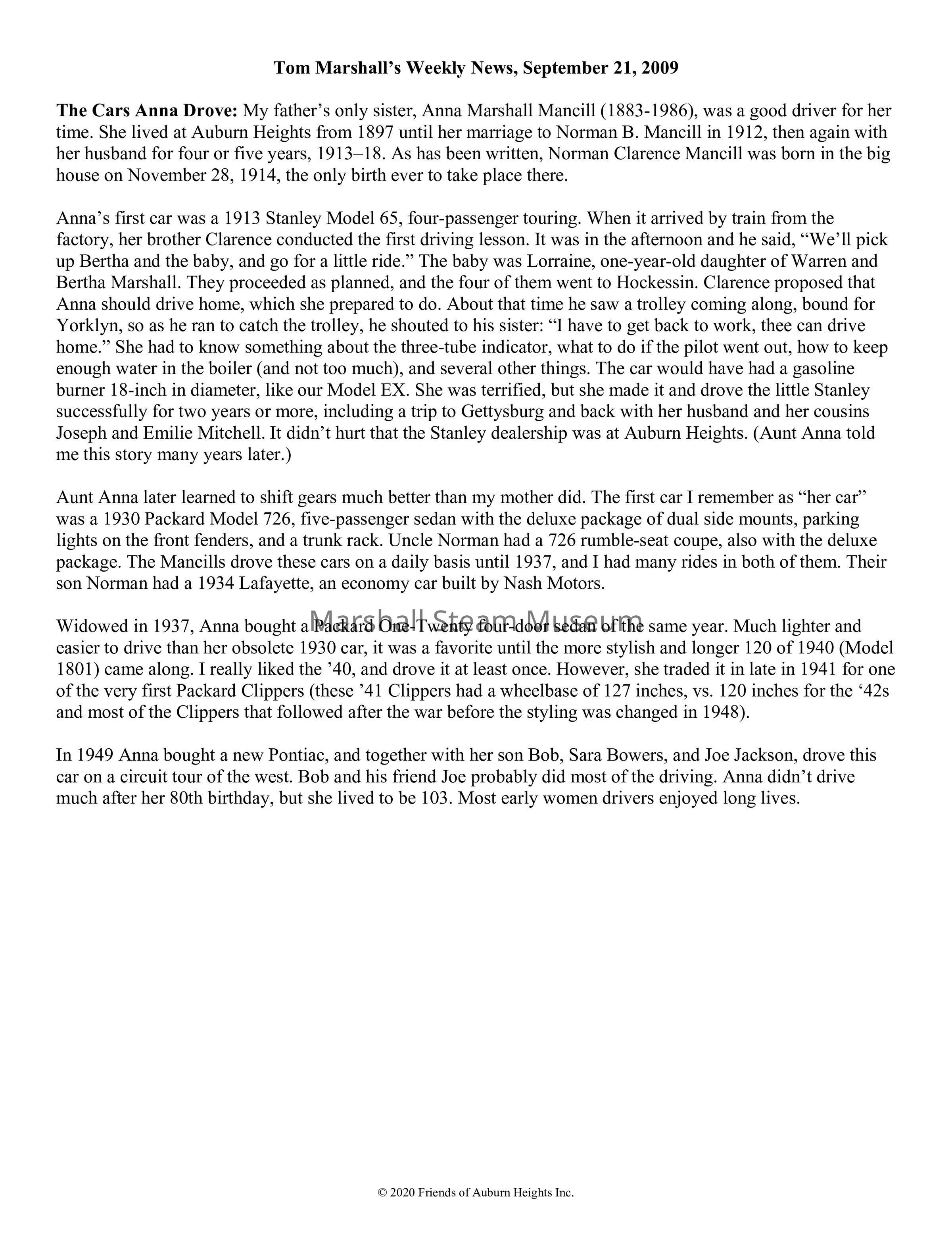 Anna’s first car was a 1913 Stanley Model 65, four-passenger touring. When it arrived by train from the