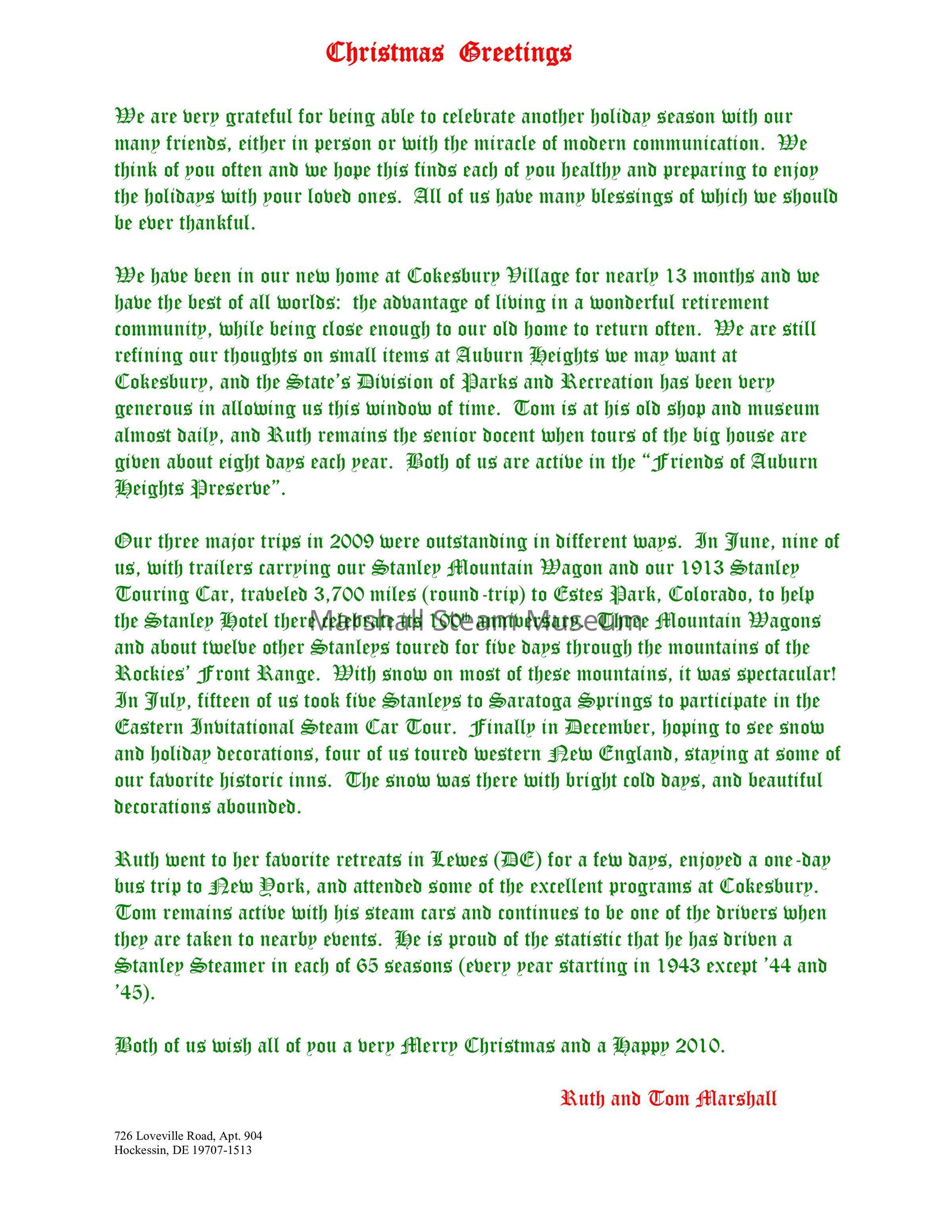 Our three major trips in 2009 were outstanding in different ways. In June, nine of us, with trailers carrying our Stanley Mountain Wagon and our 1913 Stanley Touring Car, traveled 3,700 miles (round-trip) to Estes Park, Colorado, to help the Stanley Hotel there celebrate its 100th anniversary. Three Mountain Wagons and about twelve other Stanleys toured for five days through the mountains of the Rockies’ Front Range. With snow on most of these mountains, it was spectacular! In July, fifteen of us took five Stanleys to Saratoga Springs to participate in the Eastern Invitational Steam Car Tour. Finally in December, hoping to see snow and holiday decorations, four of us toured western New England, staying at some of our favorite historic inns. The snow was there with bright cold days, and beautiful decorations abounded.