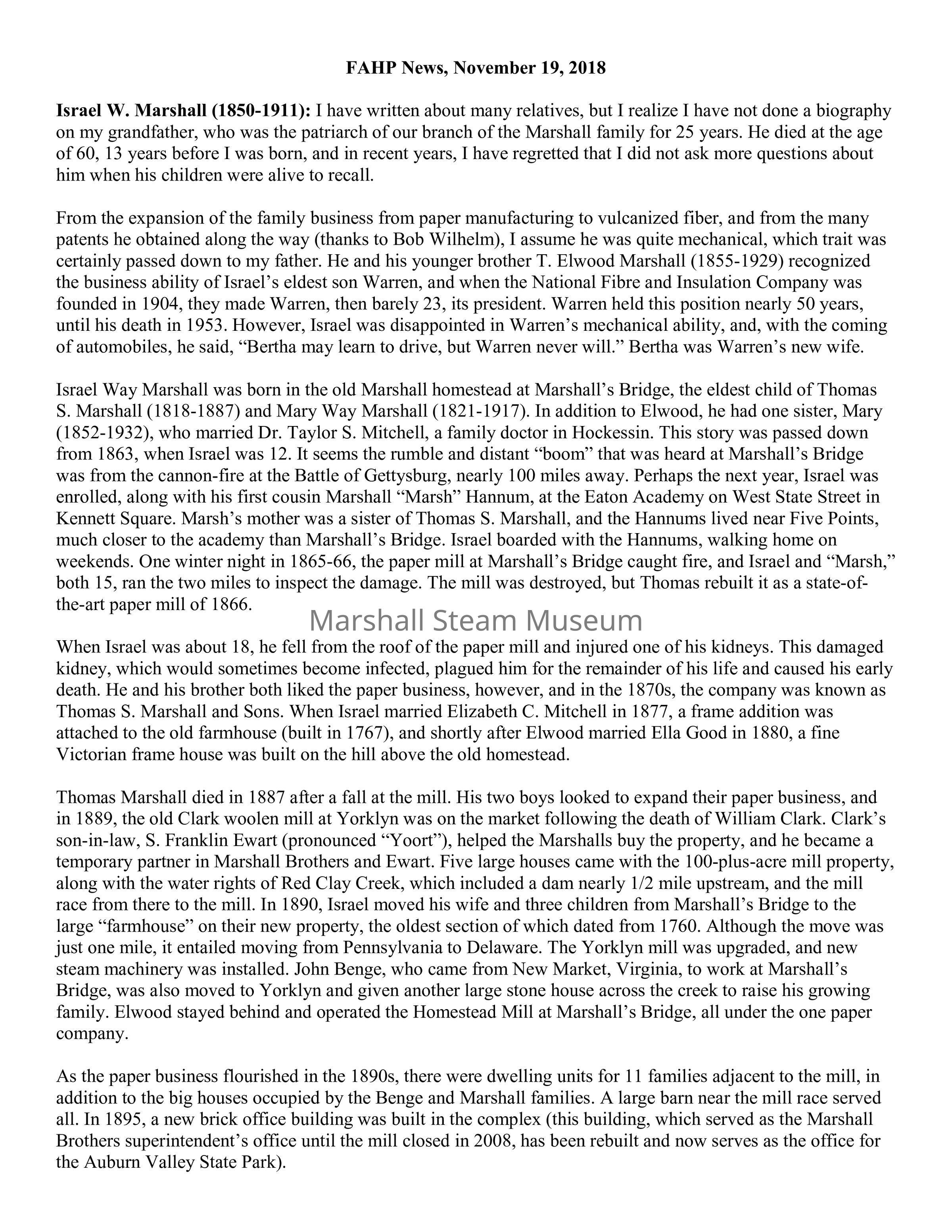 Israel Way Marshall was born in the old Marshall homestead at Marshall’s Bridge, the eldest child of Thomas S. Marshall (1818-1887) and Mary Way Marshall (1821-1917). In addition to Elwood, he had one sister, Mary (1852-1932), who married Dr. Taylor S. Mitchell, a family doctor in Hockessin. This story was passed down from 1863, when Israel was 12. It seems the rumble and distant “boom” that was heard at Marshall’s Bridge was from the cannon-fire at the Battle of Gettysburg, nearly 100 miles away. Perhaps the next year, Israel was enrolled, along with his first cousin Marshall “Marsh” Hannum, at the Eaton Academy on West State Street in Kennett Square. Marsh’s mother was a sister of Thomas S. Marshall, and the Hannums lived near Five Points, much closer to the academy than Marshall’s Bridge. Israel boarded with the Hannums, walking home on weekends. One winter night in 1865-66, the paper mill at Marshall’s Bridge caught fire, and Israel and “Marsh,” both 15, ran the two miles to inspect the damage. The mill was destroyed, but Thomas rebuilt it as a state-of-the-art paper mill of 1866.