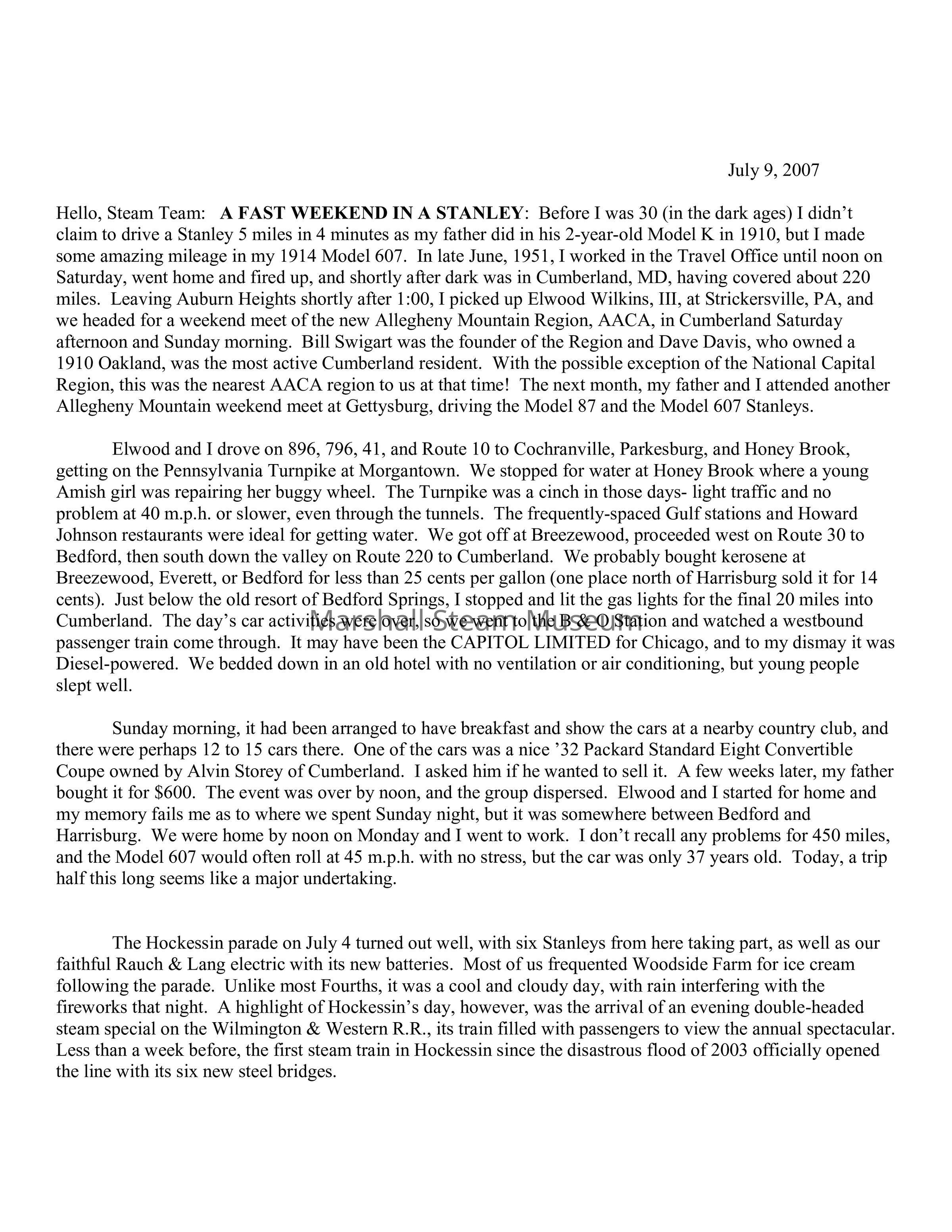 A FAST WEEKEND IN A STANLEY: Before I was 30 (in the dark ages) I didn’t claim to drive a Stanley 5 miles in 4 minutes as my father did in his 2-year-old Model K in 1910, but I made some amazing mileage in my 1914 Model 607. In late June, 1951, I worked in the Travel Office until noon on Saturday, went home and fired up, and shortly after dark was in Cumberland, MD, having covered about 220 miles. Leaving Auburn Heights shortly after 1:00, I picked up Elwood Wilkins, III, at Strickersville, PA, and we headed for a weekend meet of the new Allegheny Mountain Region, AACA, in Cumberland Saturday afternoon and Sunday morning. Bill Swigart was the founder of the Region and Dave Davis, who owned a 1910 Oakland, was the most active Cumberland resident. With the possible exception of the National Capital Region, this was the nearest AACA region to us at that time! The next month, my father and I attended another Allegheny Mountain weekend meet at Gettysburg, driving the Model 87 and the Model 607 Stanleys.