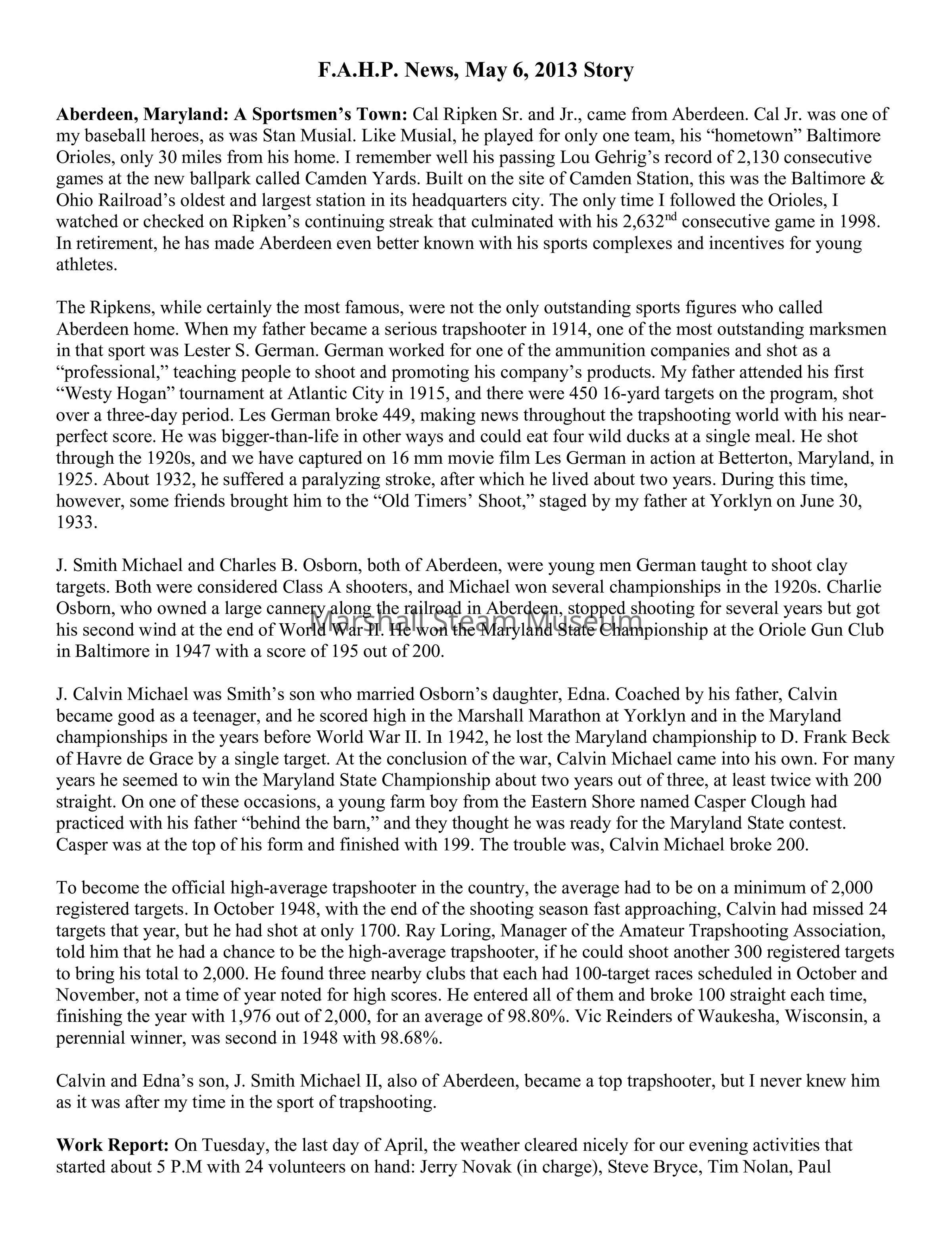 J. Smith Michael and Charles B. Osborn, both of Aberdeen, were young men German taught to shoot clay targets. Both were considered Class A shooters, and Michael won several championships in the 1920s. Charlie Osborn, who owned a large cannery along the railroad in Aberdeen, stopped shooting for several years but got his second wind at the end of World War II. He won the Maryland State Championship at the Oriole Gun Club in Baltimore in 1947 with a score of 195 out of 200.