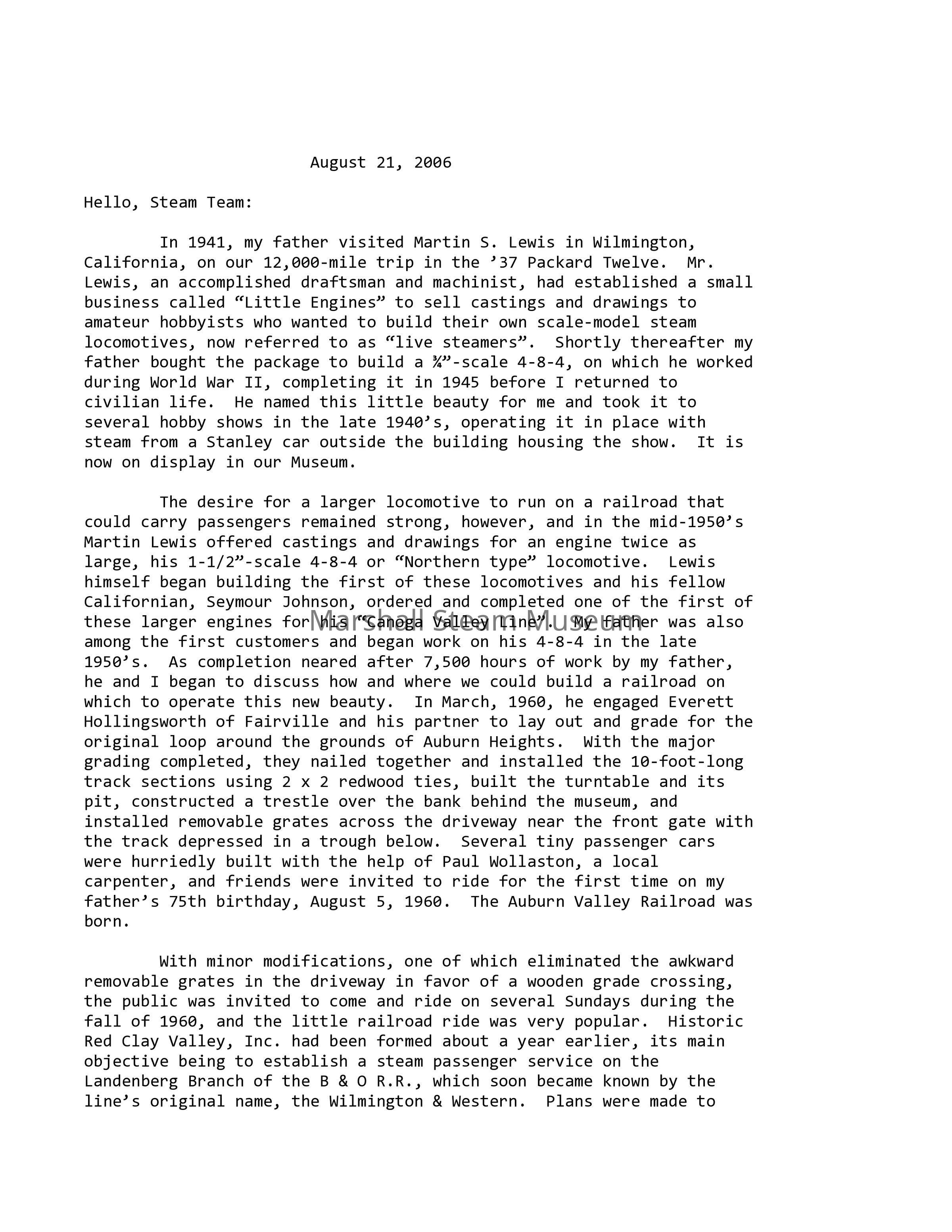 Martin Lewis died about 1959 and my father eventually convinced Mrs. Lewis that she should sell him her husband’s partially-completed prototype. My father’s original Auburn Valley locomotive had been numbered 401, and the hastily-completed “Lewis” engine became the 402. Both have served the Auburn Valley well since 1961, with some sort of service being provided in about half of the 45 years between then and now. HRCV volunteers operated the Auburn Valley for 5 seasons (1961-’65) and 33,000 passengers were carried raising $15,000 for Historic Red Clay Valley, Inc. (The continuing story of the “Auburn Valley” will be covered next week).