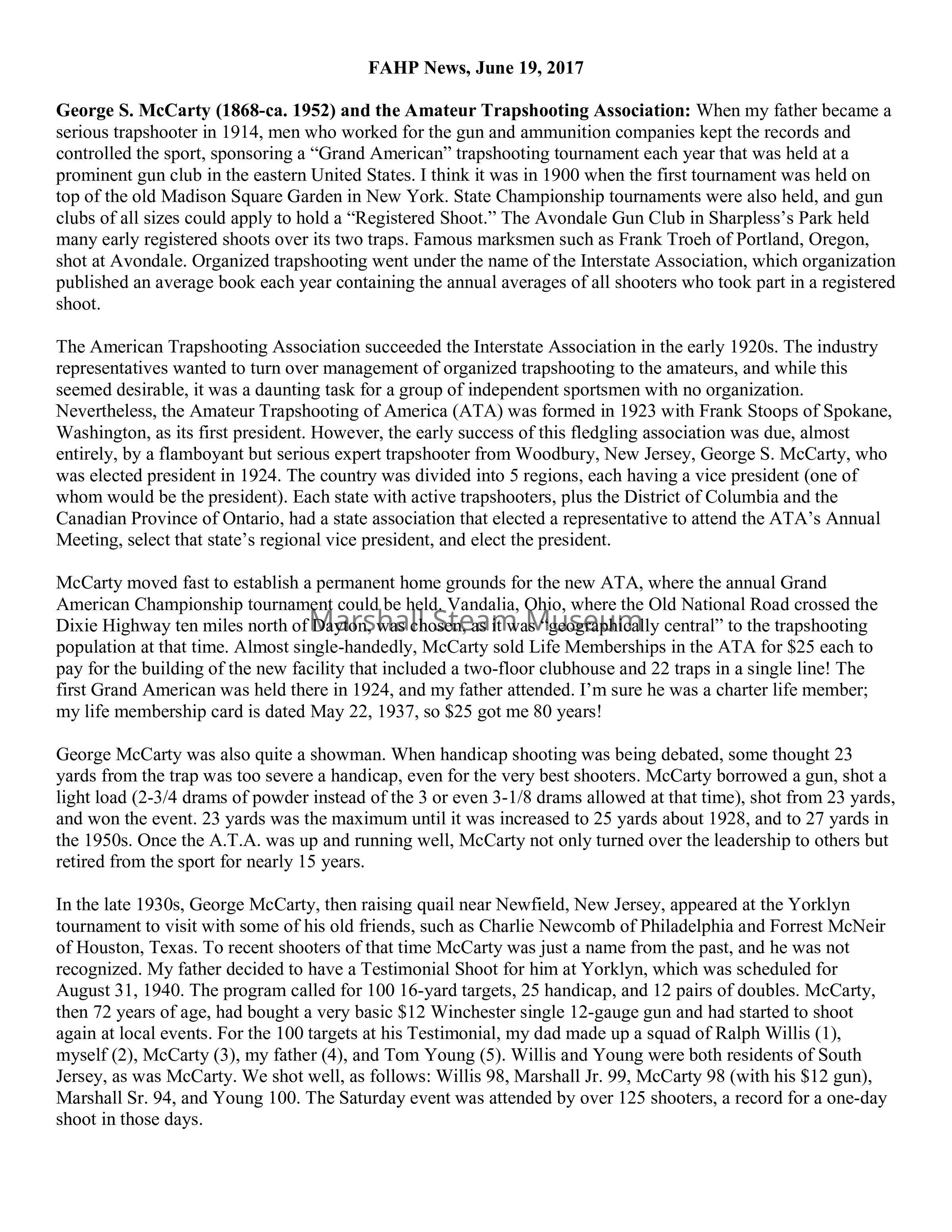 George S. McCarty (1868-ca. 1952) and the Amateur Trapshooting Association: When my father became a serious trapshooter in 1914, men who worked for the gun and ammunition companies kept the records and controlled the sport, sponsoring a “Grand American” trapshooting tournament each year that was held at a prominent gun club in the eastern United States. I think it was in 1900 when the first tournament was held on top of the old Madison Square Garden in New York. State Championship tournaments were also held, and gun clubs of all sizes could apply to hold a “Registered Shoot.” The Avondale Gun Club in Sharpless’s Park held many early registered shoots over its two traps. Famous marksmen such as Frank Troeh of Portland, Oregon, shot at Avondale. Organized trapshooting went under the name of the Interstate Association, which organization published an average book each year containing the annual averages of all shooters who took part in a registered shoot.