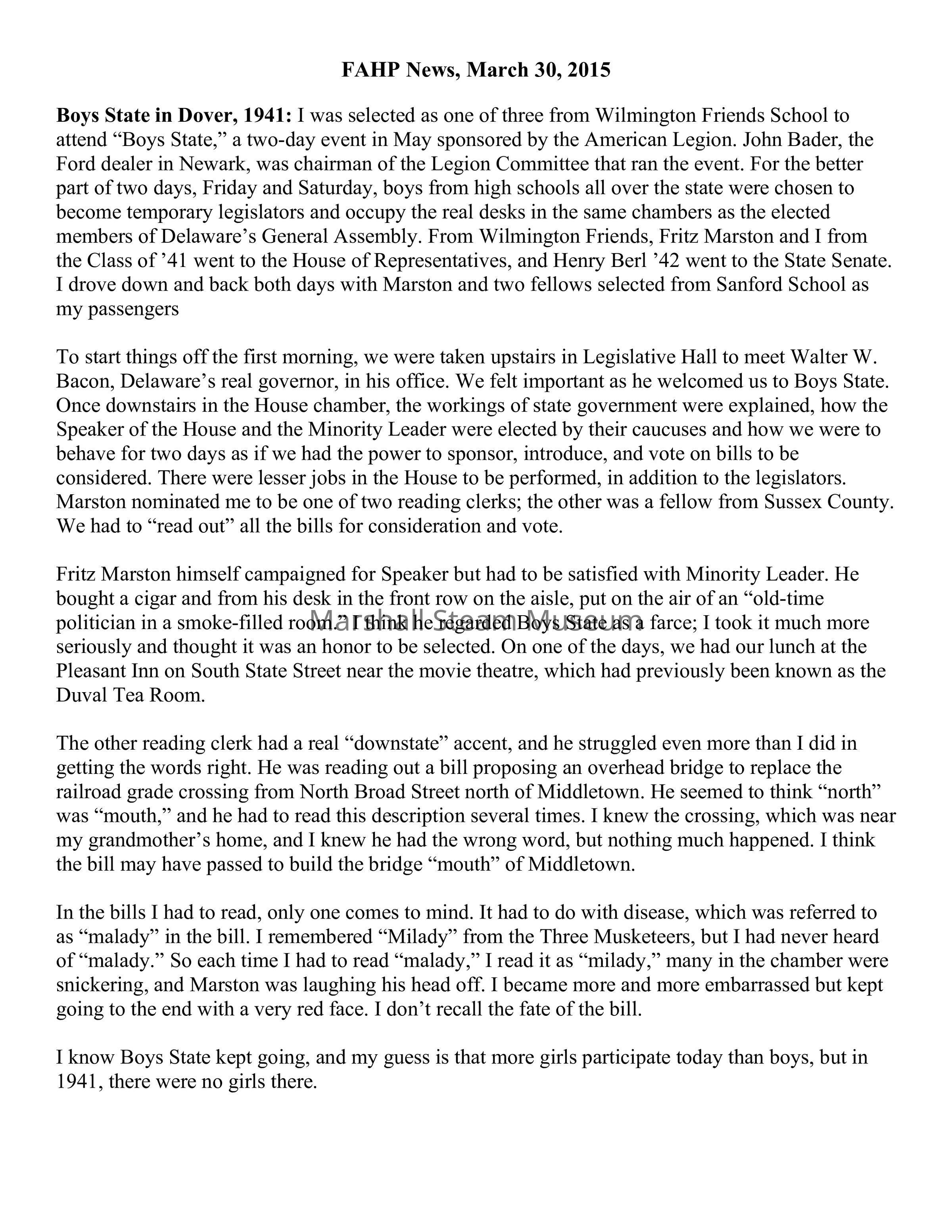 Boys State in Dover, 1941: I was selected as one of three from Wilmington Friends School to attend “Boys State,” a two-day event in May sponsored by the American Legion. John Bader, the Ford dealer in Newark, was chairman of the Legion Committee that ran the event. For the better part of two days, Friday and Saturday, boys from high schools all over the state were chosen to become temporary legislators and occupy the real desks in the same chambers as the elected members of Delaware’s General Assembly. From Wilmington Friends, Fritz Marston and I from the Class of ’41 went to the House of Representatives, and Henry Berl ’42 went to the State Senate. I drove down and back both days with Marston and two fellows selected from Sanford School as my passengers