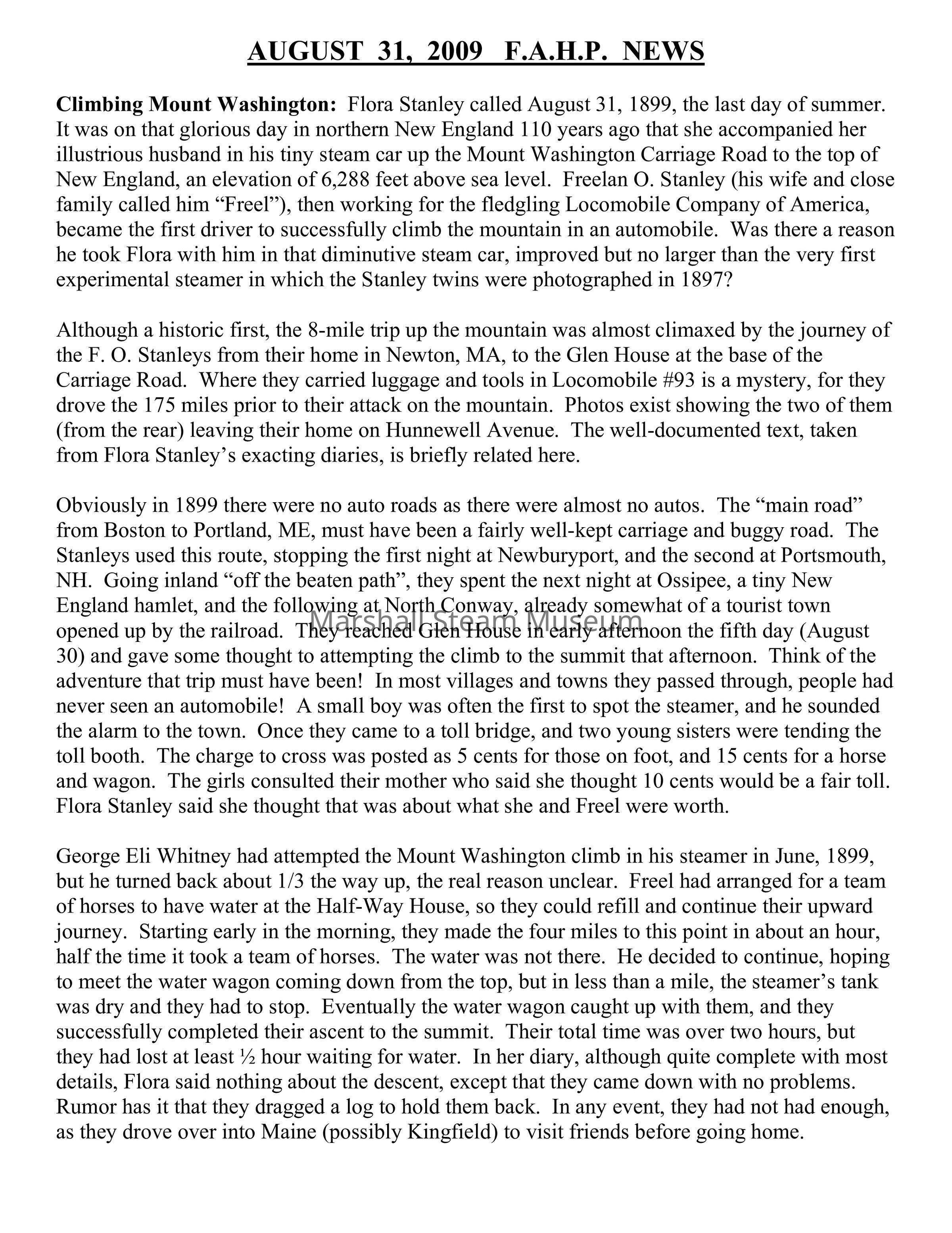 George Eli Whitney had attempted the Mount Washington climb in his steamer in June, 1899, but he turned back about 1/3 the way up, the real reason unclear. Freel had arranged for a team of horses to have water at the Half-Way House, so they could refill and continue their upward journey. Starting early in the morning, they made the four miles to this point in about an hour, half the time it took a team of horses. The water was not there. He decided to continue, hoping to meet the water wagon coming down from the top, but in less than a mile, the steamer’s tank was dry and they had to stop. Eventually the water wagon caught up with them, and they successfully completed their ascent to the summit. Their total time was over two hours, but they had lost at least ½ hour waiting for water. In her diary, although quite complete with most details, Flora said nothing about the descent, except that they came down with no problems. Rumor has it that they dragged a log to hold them back. In any event, they had not had enough, as they drove over into Maine (possibly Kingfield) to visit friends before going home.