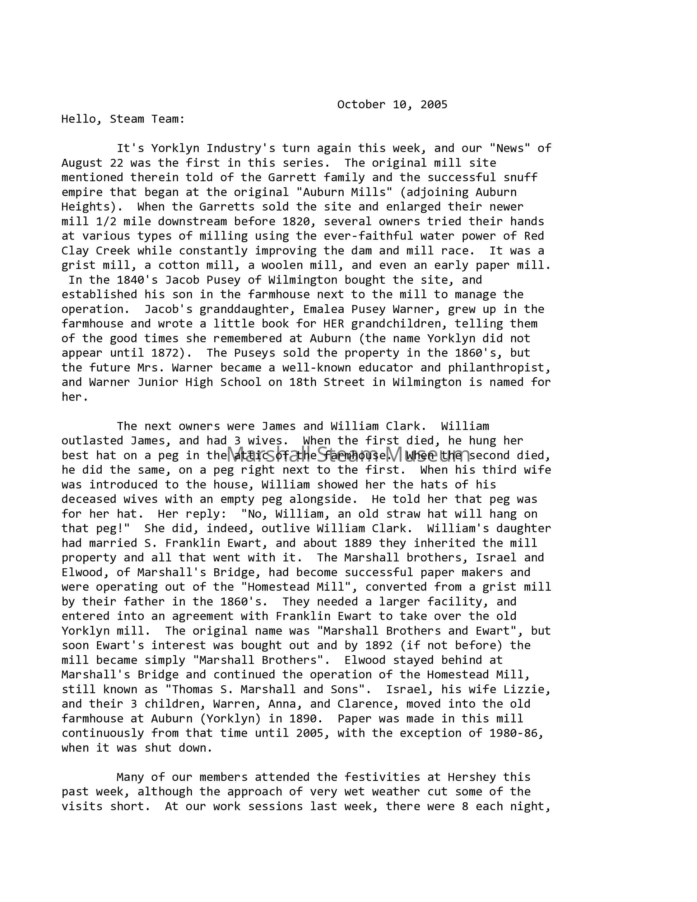The next owners were James and William Clark. William outlasted James, and had 3 wives. When the first died, he hung her best hat on a peg in the attic of the farmhouse. When the second died, he did the same, on a peg right next to the first. When his third wife was introduced to the house, William showed her the hats of his deceased wives with an empty peg alongside. He told her that peg was for her hat. Her reply: "No, William, an old straw hat will hang on that peg!" She did, indeed, outlive William Clark. William's daughter had married S. Franklin Ewart, and about 1889 they inherited the mill property and all that went with it. The Marshall brothers, Israel and Elwood, of Marshall's Bridge, had become successful paper makers and were operating out of the "Homestead Mill", converted from a grist mill by their father in the 1860's. They needed a larger facility, and entered into an agreement with Franklin Ewart to take over the old Yorklyn mill. The original name was "Marshall Brothers and Ewart", but soon Ewart's interest was bought out and by 1892 (if not before) the mill became simply "Marshall Brothers". Elwood stayed behind at Marshall's Bridge and continued the operation of the Homestead Mill, still known as "Thomas S. Marshall and Sons". Israel, his wife Lizzie, and their 3 children, Warren, Anna, and Clarence, moved into the old farmhouse at Auburn (Yorklyn) in 1890. Paper was made in this mill continuously from that time until 2005, with the exception of 1980-86, when it was shut down.