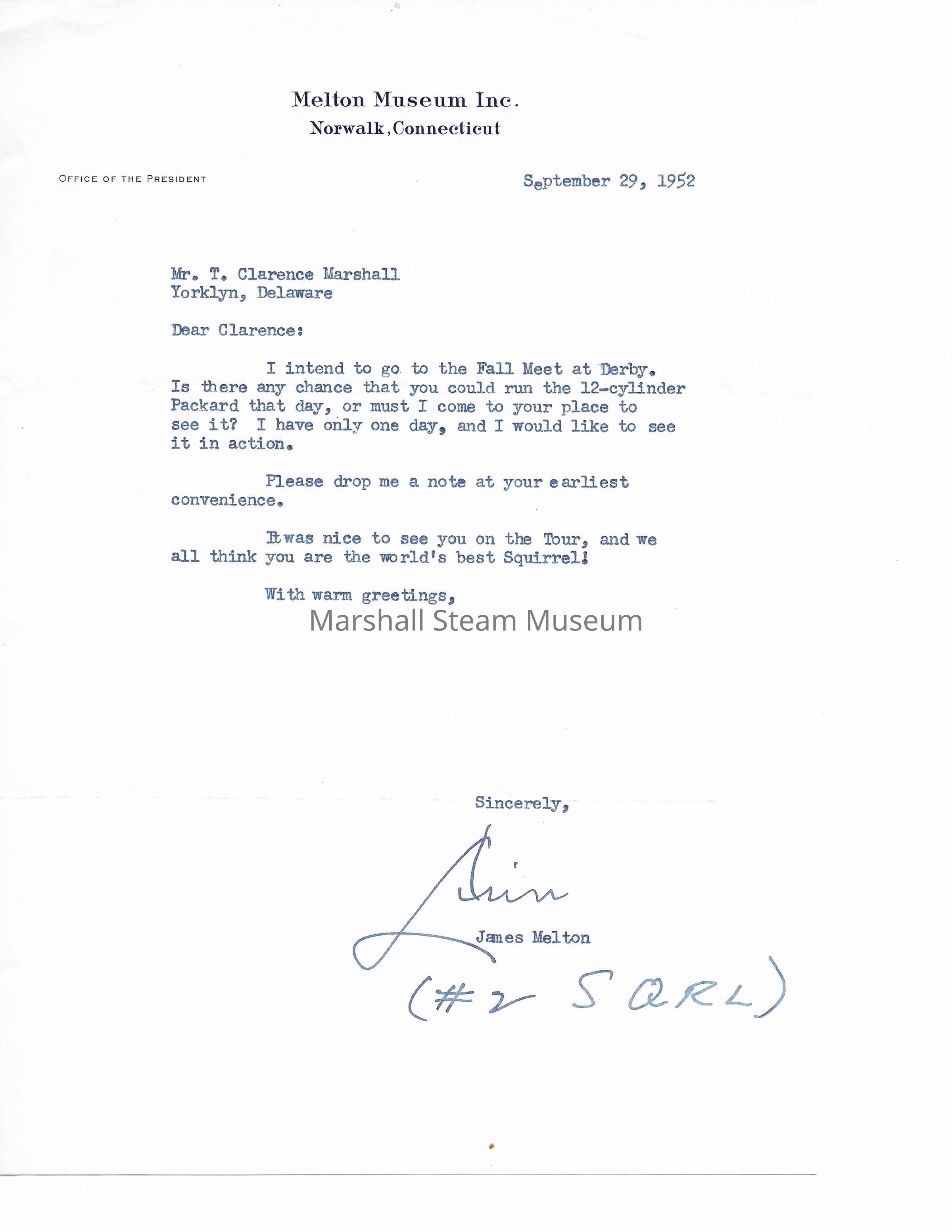 1952 letter from James Melton to T Clarence Marshall regarding upcoming car meet