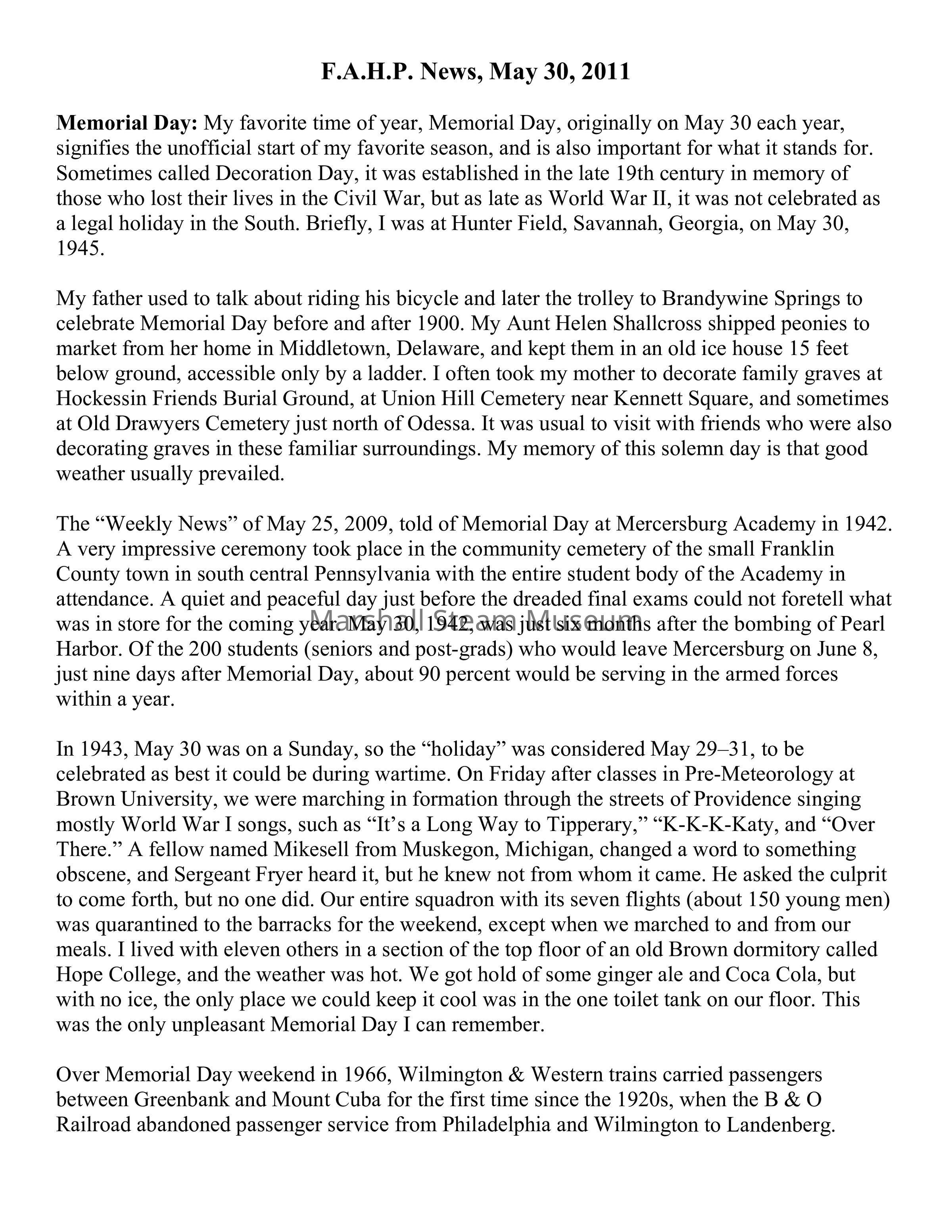 My father used to talk about riding his bicycle and later the trolley to Brandywine Springs to celebrate Memorial Day before and after 1900. My Aunt Helen Shallcross shipped peonies to market from her home in Middletown, Delaware, and kept them in an old ice house 15 feet below ground, accessible only by a ladder. I often took my mother to decorate family graves at Hockessin Friends Burial Ground, at Union Hill Cemetery near Kennett Square, and sometimes at Old Drawyers Cemetery just north of Odessa. It was usual to visit with friends who were also decorating graves in these familiar surroundings. My memory of this solemn day is that good weather usually prevailed.