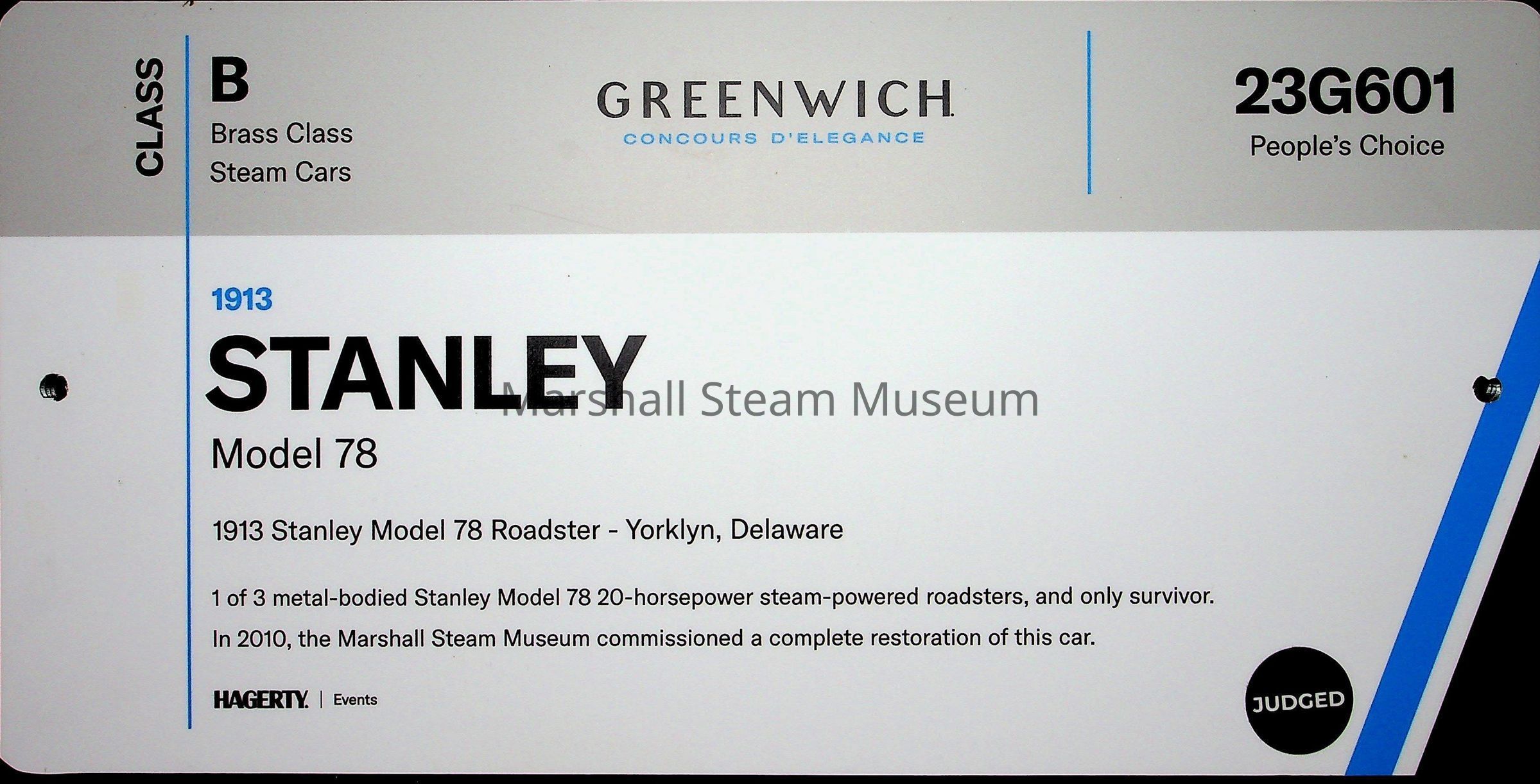 License plate from the 2023 Greenwich Concours D'Elegance exhibition of the 1913 Stanley Model 78 held June 2023
