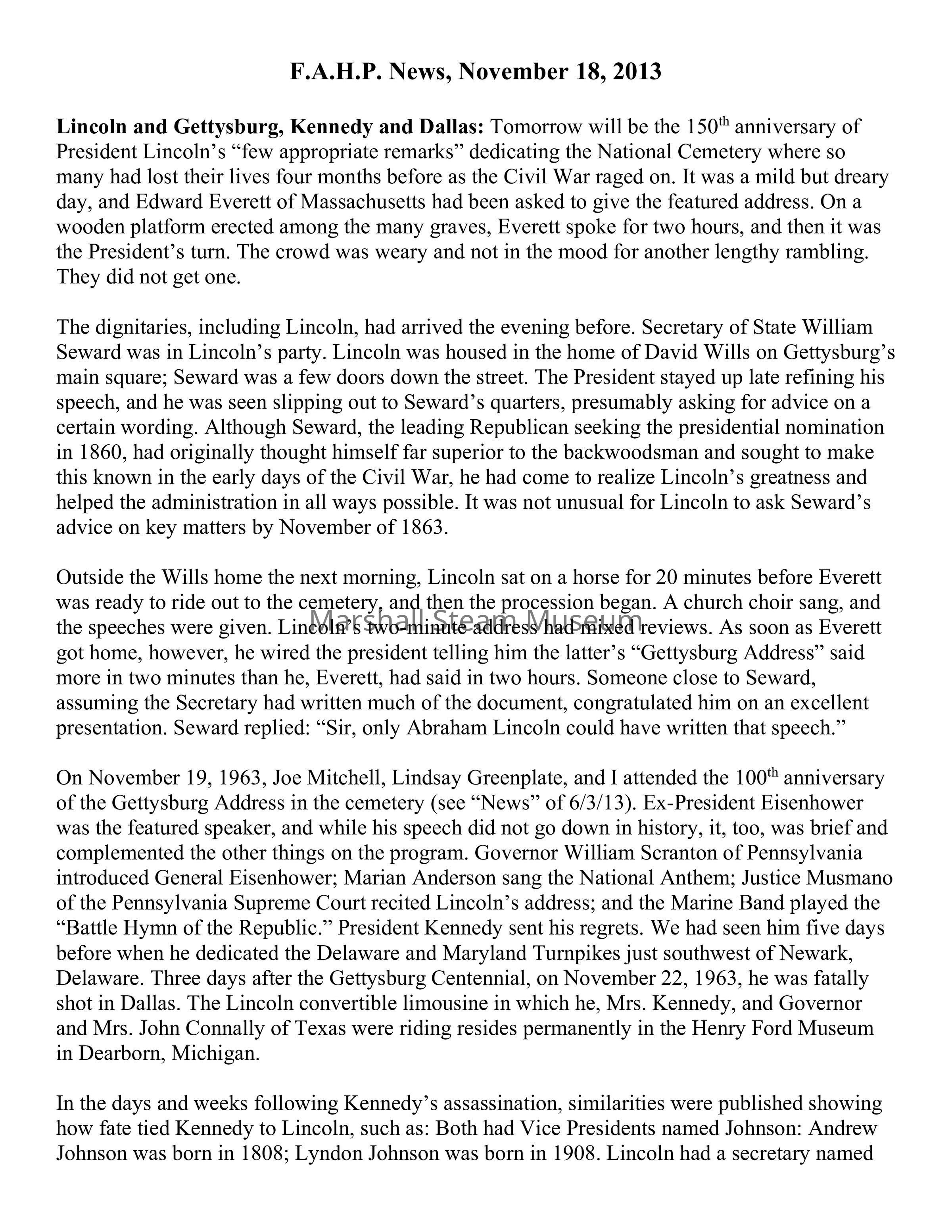 On November 19, 1963, Joe Mitchell, Lindsay Greenplate, and I attended the 100th anniversary of the Gettysburg Address in the cemetery (see “News” of 6/3/13). Ex-President Eisenhower was the featured speaker, and while his speech did not go down in history, it, too, was brief and complemented the other things on the program. Governor William Scranton of Pennsylvania introduced General Eisenhower; Marian Anderson sang the National Anthem; Justice Musmano of the Pennsylvania Supreme Court recited Lincoln’s address; and the Marine Band played the “Battle Hymn of the Republic.” President Kennedy sent his regrets. We had seen him five days before when he dedicated the Delaware and Maryland Turnpikes just southwest of Newark, Delaware. Three days after the Gettysburg Centennial, on November 22, 1963, he was fatally shot in Dallas. The Lincoln convertible limousine in which he, Mrs. Kennedy, and Governor and Mrs. John Connally of Texas were riding resides permanently in the Henry Ford Museum in Dearborn, Michigan.