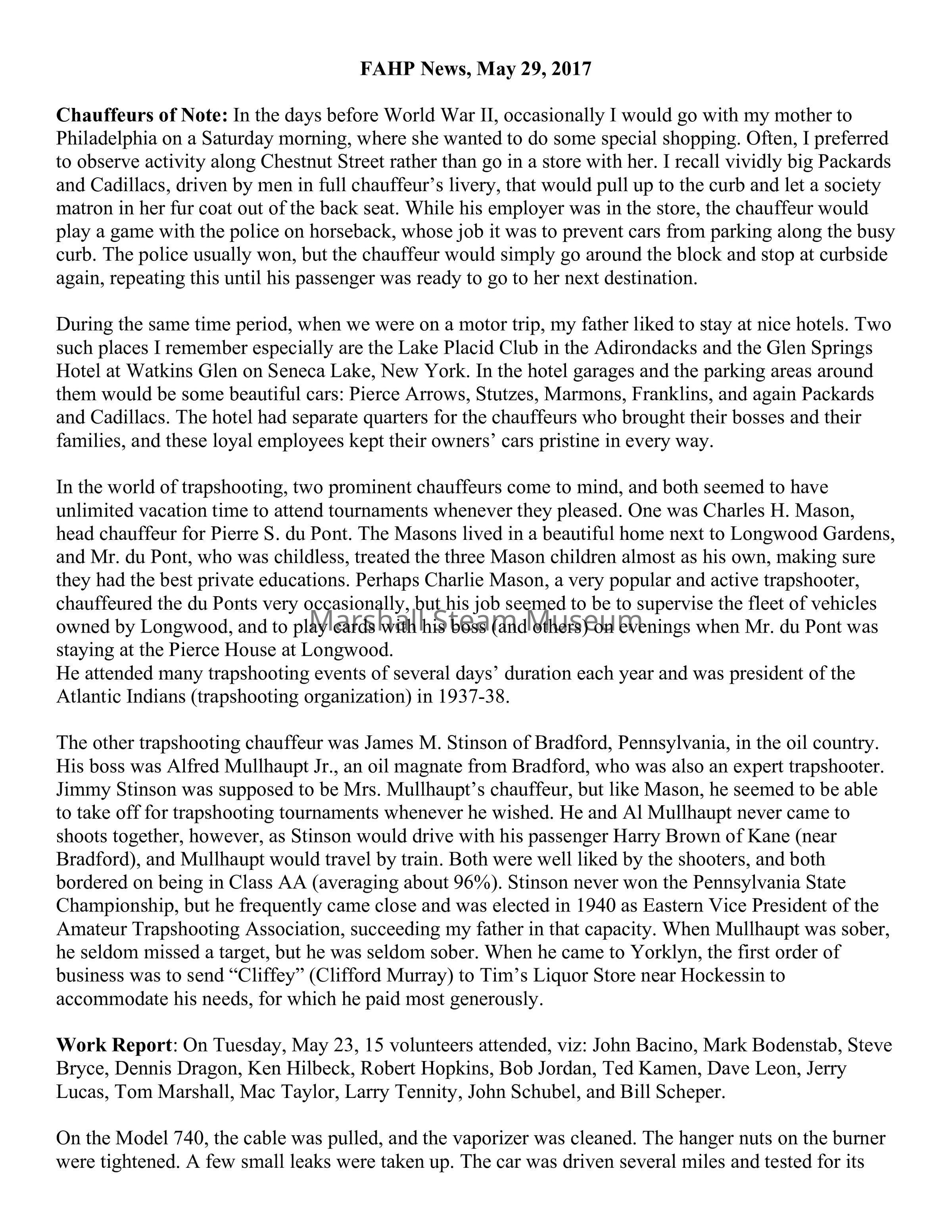 On the Model 740, the cable was pulled, and the vaporizer was cleaned. The hanger nuts on the burner were tightened. A few small leaks were taken up. The car was driven several miles and tested for its use at the Memorial Day parade in Kennett Square on May 29. On the Model 735, the banjo bolt on the pilot was reworked and now believed to be tight. Dry wall work continued on the ceiling of the shop under the supervision of Mark Bodenstab, and the panels are ready for sealing the joints. Work continued on the ’37 Packard and on the Lionel electric trains.