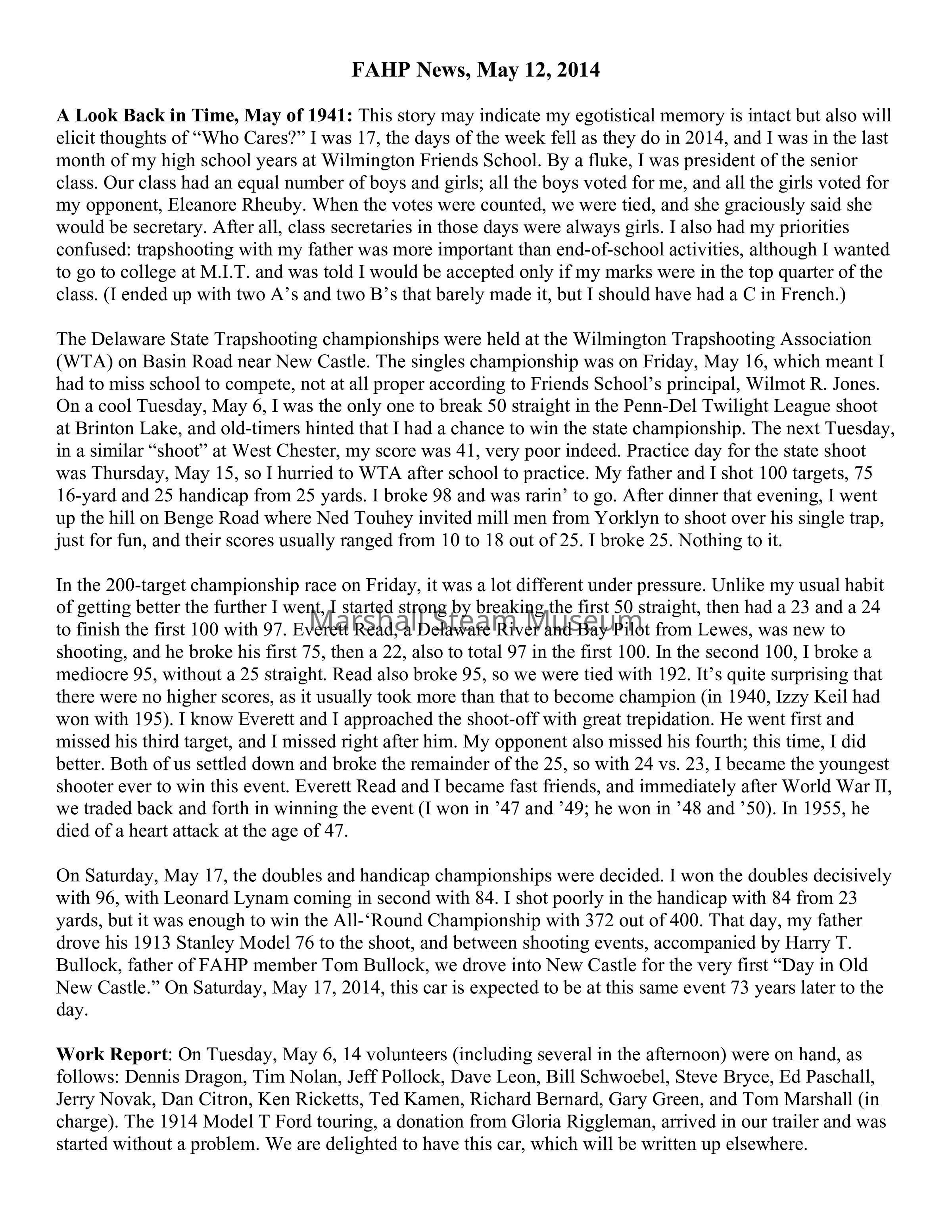 On Saturday, May 17, the doubles and handicap championships were decided. I won the doubles decisively with 96, with Leonard Lynam coming in second with 84. I shot poorly in the handicap with 84 from 23 yards, but it was enough to win the All-‘Round Championship with 372 out of 400. That day, my father drove his 1913 Stanley Model 76 to the shoot, and between shooting events, accompanied by Harry T. Bullock, father of FAHP member Tom Bullock, we drove into New Castle for the very first “Day in Old New Castle.” On Saturday, May 17, 2014, this car is expected to be at this same event 73 years later to the day.