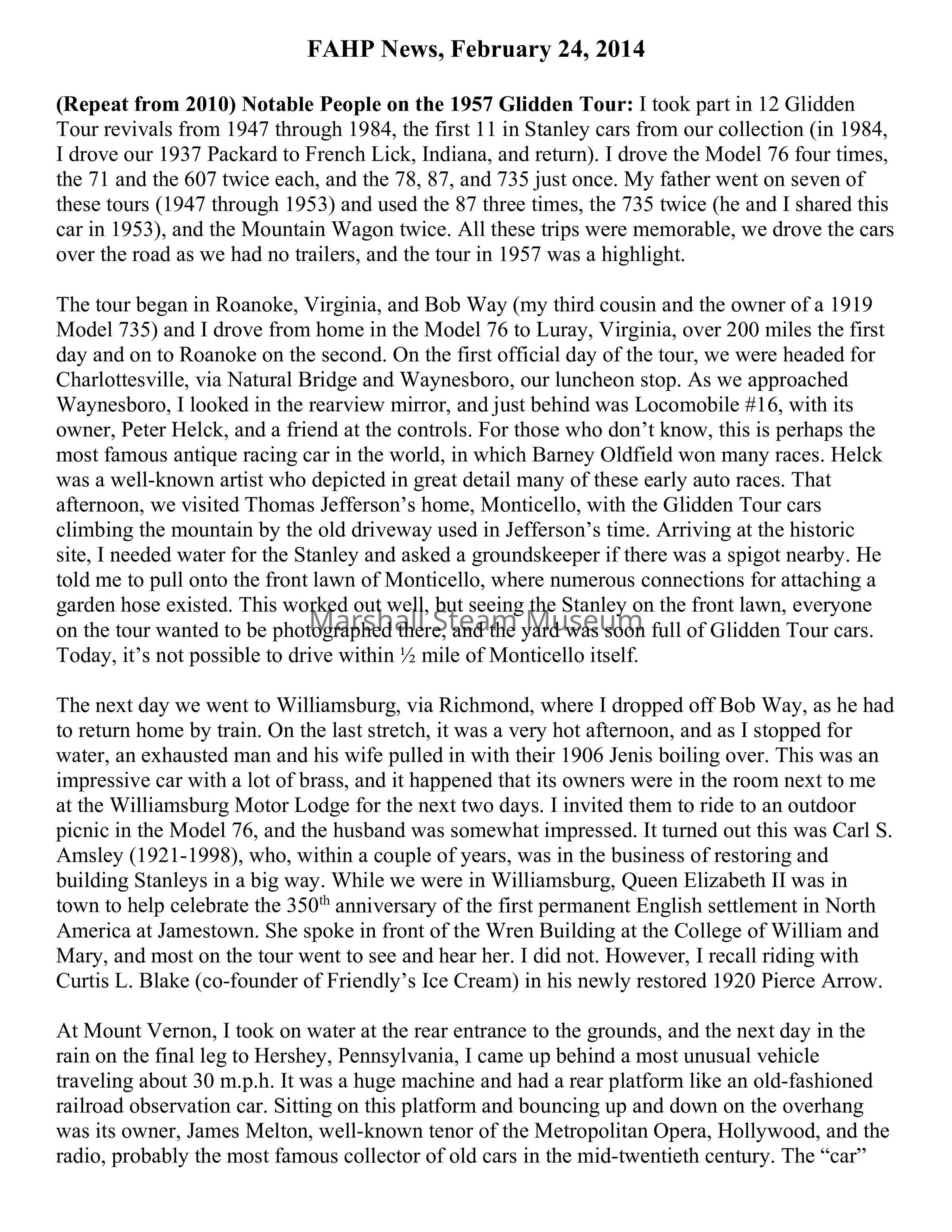 (Repeat from 2010) Notable People on the 1957 Glidden Tour: I took part in 12 Glidden Tour revivals from 1947 through 1984, the first 11 in Stanley cars from our collection (in 1984, I drove our 1937 Packard to French Lick, Indiana, and return). I drove the Model 76 four times, the 71 and the 607 twice each, and the 78, 87, and 735 just once. My father went on seven of these tours (1947 through 1953) and used the 87 three times, the 735 twice (he and I shared this car in 1953), and the Mountain Wagon twice. All these trips were memorable, we drove the cars over the road as we had no trailers, and the tour in 1957 was a highlight.