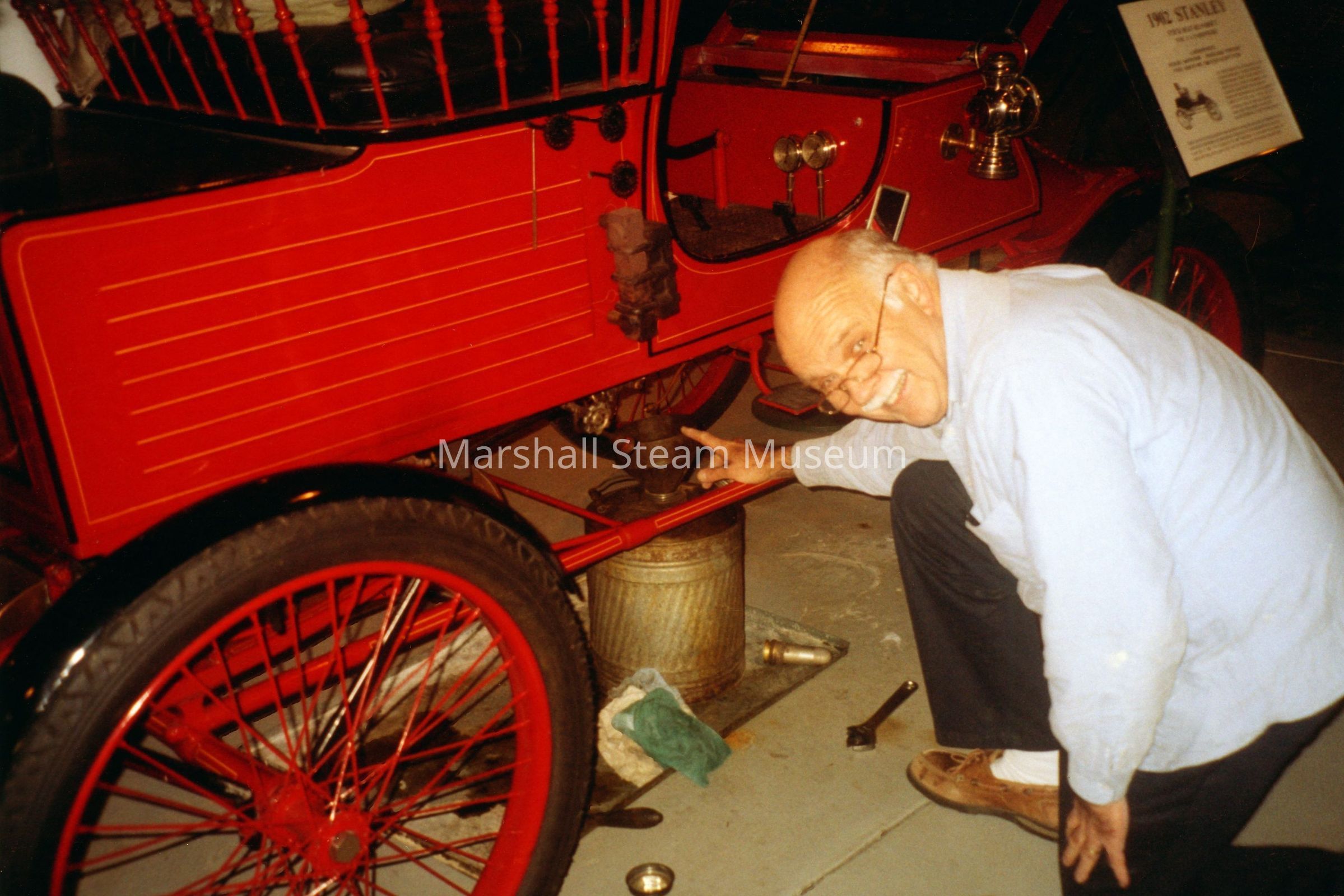 Richard Bernard drains fuel from the 1902 Stanley Runabout