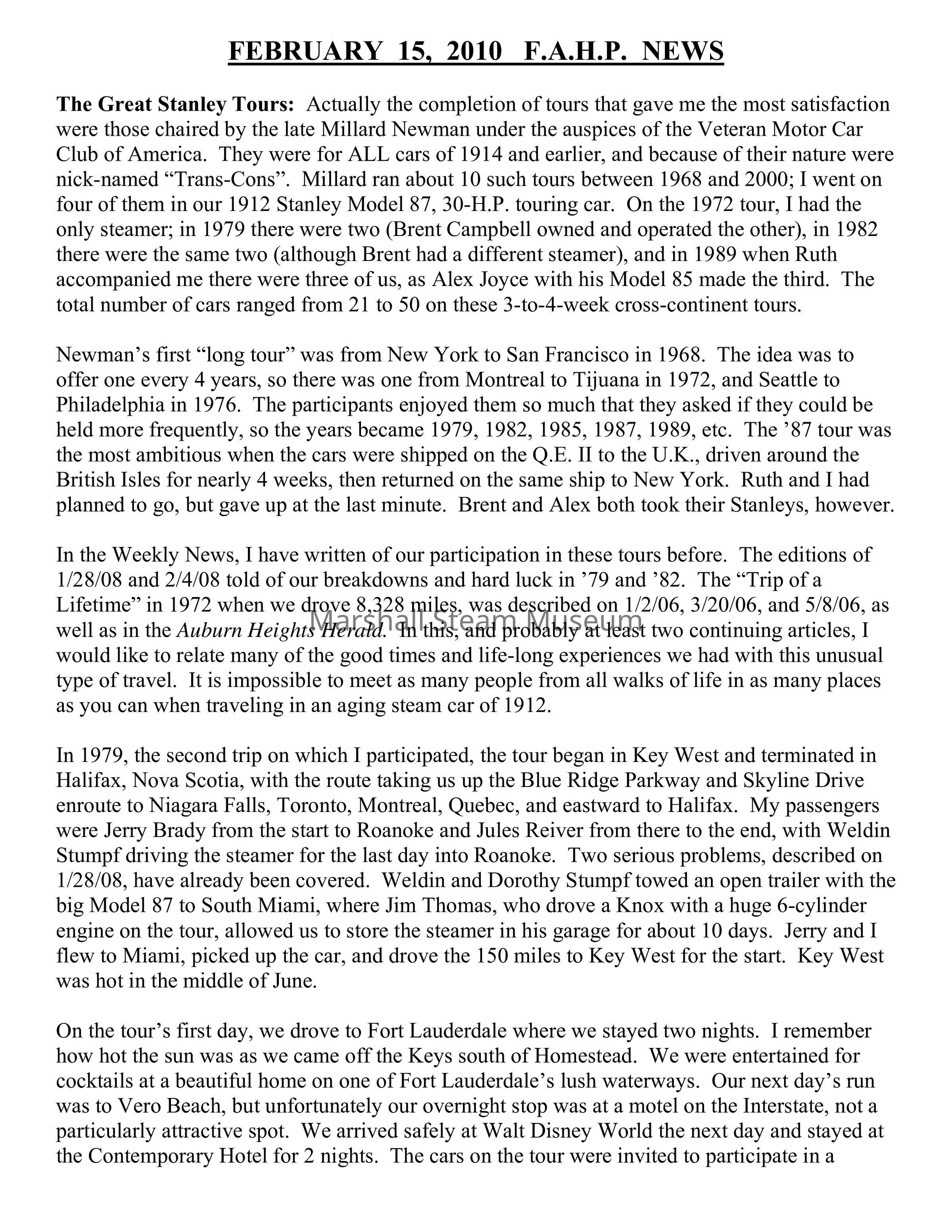 Newman’s first “long tour” was from New York to San Francisco in 1968. The idea was to offer one every 4 years, so there was one from Montreal to Tijuana in 1972, and Seattle to Philadelphia in 1976. The participants enjoyed them so much that they asked if they could be held more frequently, so the years became 1979, 1982, 1985, 1987, 1989, etc. The ’87 tour was the most ambitious when the cars were shipped on the Q.E. II to the U.K., driven around the British Isles for nearly 4 weeks, then returned on the same ship to New York. Ruth and I had planned to go, but gave up at the last minute. Brent and Alex both took their Stanleys, however.