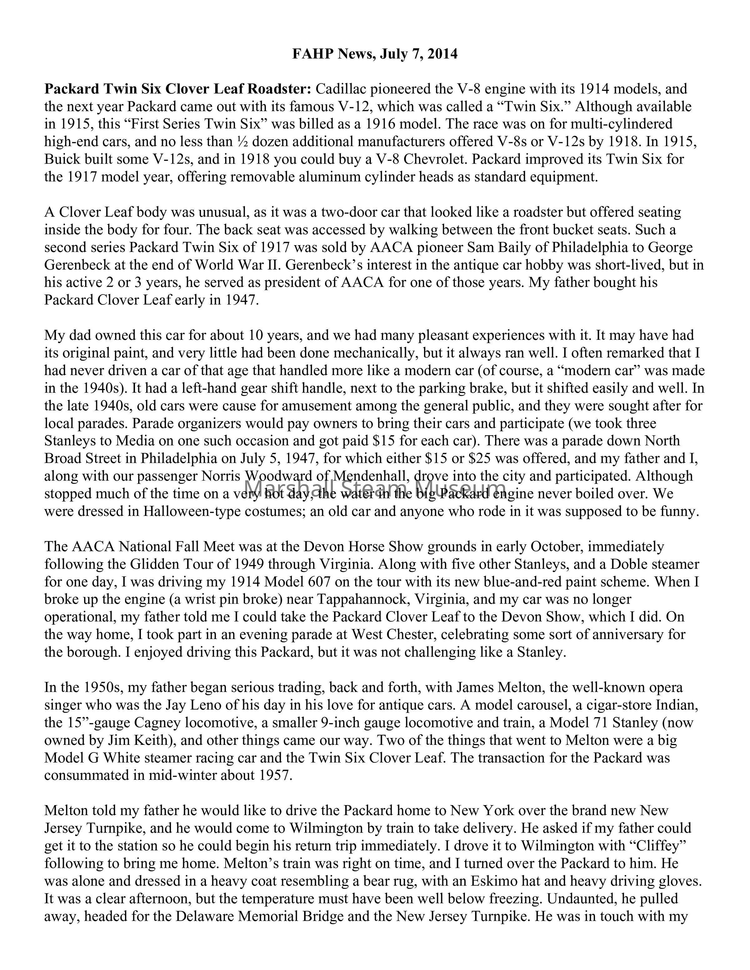 My dad owned this car for about 10 years, and we had many pleasant experiences with it. It may have had its original paint, and very little had been done mechanically, but it always ran well. I often remarked that I had never driven a car of that age that handled more like a modern car (of course, a “modern car” was made in the 1940s). It had a left-hand gear shift handle, next to the parking brake, but it shifted easily and well. In the late 1940s, old cars were cause for amusement among the general public, and they were sought after for local parades. Parade organizers would pay owners to bring their cars and participate (we took three Stanleys to Media on one such occasion and got paid $15 for each car). There was a parade down North Broad Street in Philadelphia on July 5, 1947, for which either $15 or $25 was offered, and my father and I, along with our passenger Norris Woodward of Mendenhall, drove into the city and participated. Although stopped much of the time on a very hot day, the water in the big Packard engine never boiled over. We were dressed in Halloween-type costumes; an old car and anyone who rode in it was supposed to be funny.