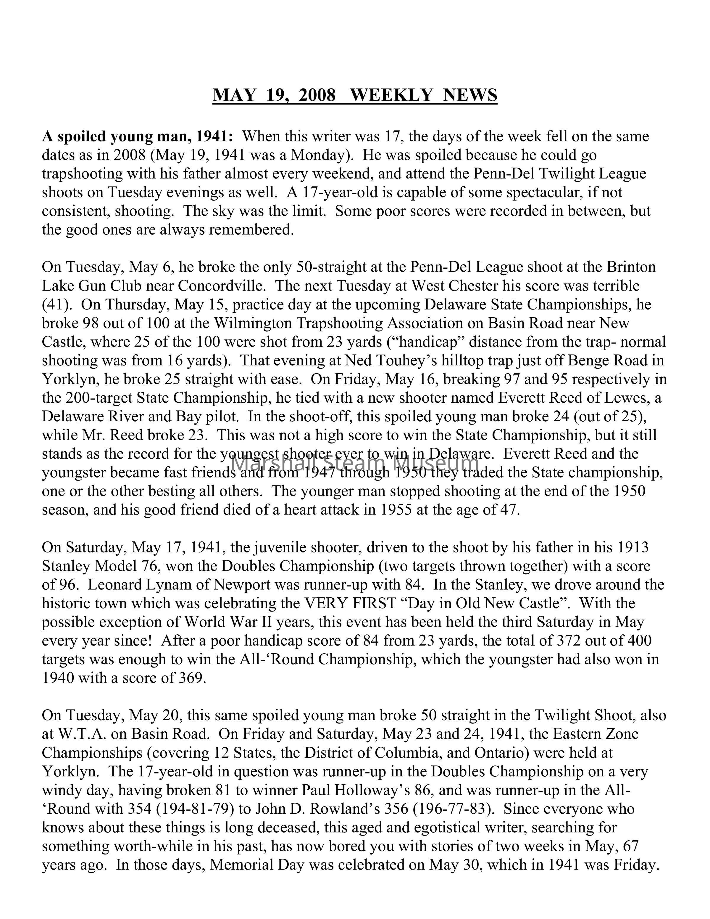 A spoiled young man, 1941: When this writer was 17, the days of the week fell on the same dates as in 2008 (May 19, 1941 was a Monday). He was spoiled because he could go trapshooting with his father almost every weekend, and attend the Penn-Del Twilight League shoots on Tuesday evenings as well. A 17-year-old is capable of some spectacular, if not consistent, shooting. The sky was the limit. Some poor scores were recorded in between, but the good ones are always remembered.