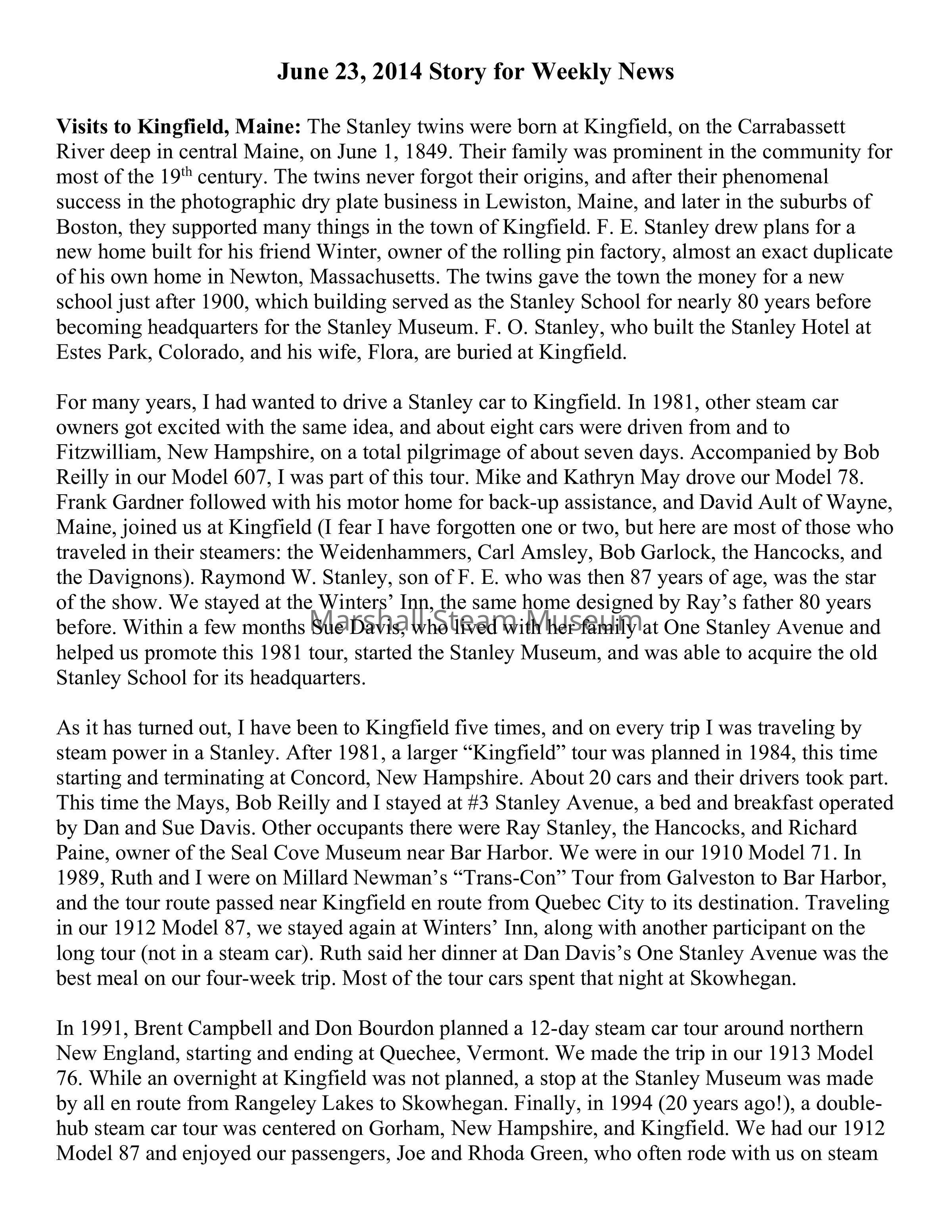 In 1991, Brent Campbell and Don Bourdon planned a 12-day steam car tour around northern New England, starting and ending at Quechee, Vermont. We made the trip in our 1913 Model 76. While an overnight at Kingfield was not planned, a stop at the Stanley Museum was made by all en route from Rangeley Lakes to Skowhegan. Finally, in 1994 (20 years ago!), a double-hub steam car tour was centered on Gorham, New Hampshire, and Kingfield. We had our 1912 Model 87 and enjoyed our passengers, Joe and Rhoda Green, who often rode with us on steam car tours. Rhoda was the daughter of famed Stanley racing car driver Fred Marriott. With our trailers at the Town and Country Motel in Gorham, we made the trip of 90 miles each way to Kingfield and return and spent one or two nights, again at the Winters’ Inn. This turned out to be Joe Green’s last tour (Rhoda and her daughter ,Virginia Landry, rode with us in the Model 87 at South Lee, Massachusetts, in 1997). It was also the last tour on which Frank Gardner drove his well-known 1912 Model 74. Following the 1994 tour, Brent Campbell took delivery, and 20 years later he still prizes it as one of his choicest cars.