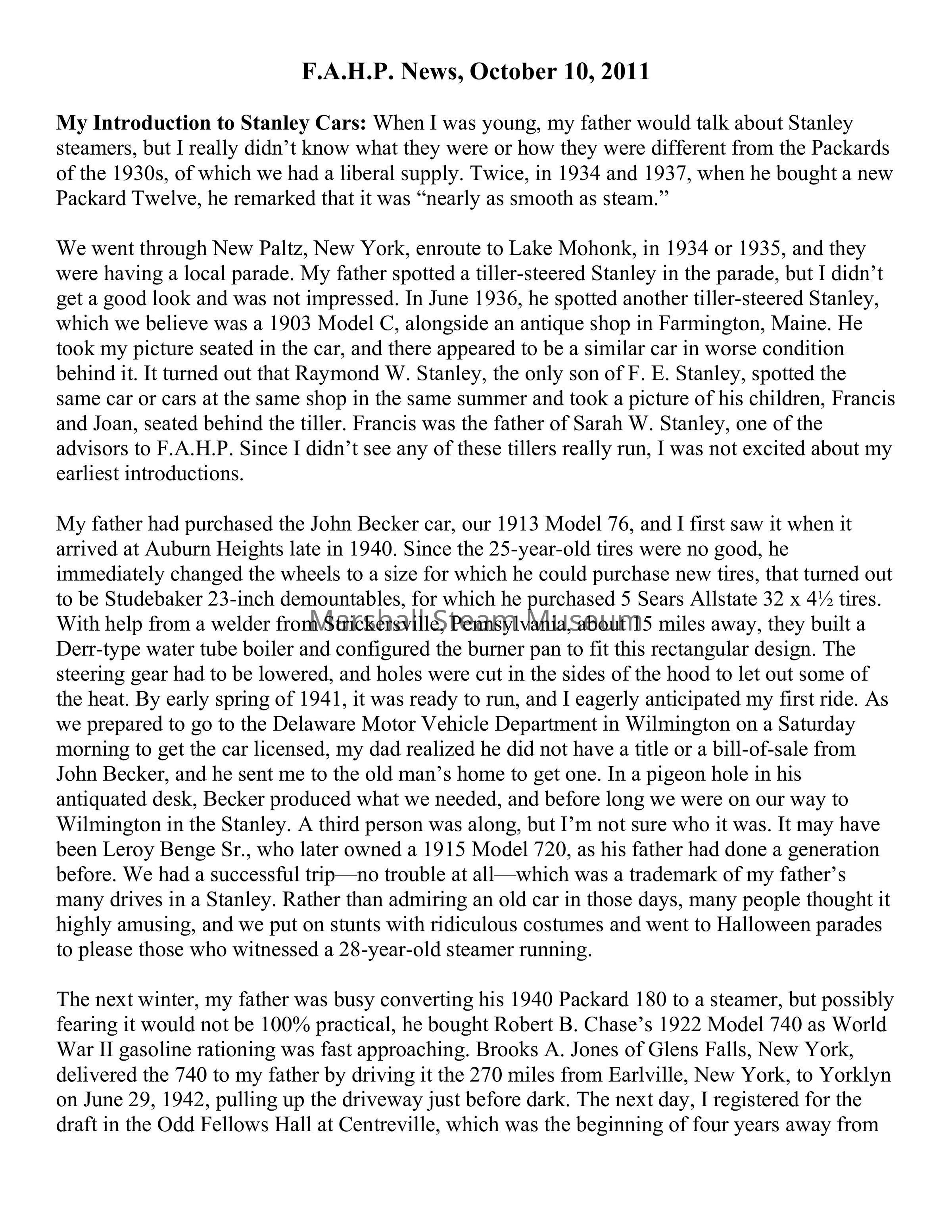 My Introduction to Stanley Cars: When I was young, my father would talk about Stanley steamers, but I really didn’t know what they were or how they were different from the Packards of the 1930s, of which we had a liberal supply. Twice, in 1934 and 1937, when he bought a new Packard Twelve, he remarked that it was “nearly as smooth as steam.”