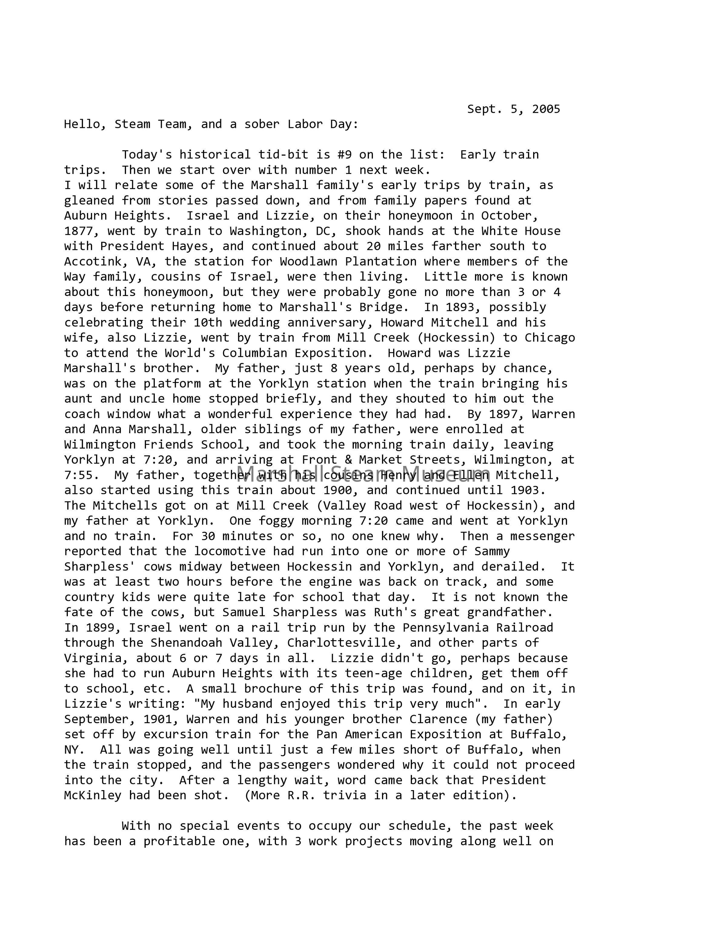 Today's historical tid-bit is #9 on the list: Early train trips. Then we start over with number 1 next week. I will relate some of the Marshall family's early trips by train, as gleaned from stories passed down, and from family papers found at Auburn Heights. Israel and Lizzie, on their honeymoon in October, 1877, went by train to Washington, DC, shook hands at the White House with President Hayes, and continued about 20 miles farther south to Accotink, VA, the station for Woodlawn Plantation where members of the Way family, cousins of Israel, were then living. Little more is known about this honeymoon, but they were probably gone no more than 3 or 4 days before returning home to Marshall's Bridge. In 1893, possibly celebrating their 10th wedding anniversary, Howard Mitchell and his wife, also Lizzie, went by train from Mill Creek (Hockessin) to Chicago to attend the World's Columbian Exposition. Howard was Lizzie Marshall's brother. My father, just 8 years old, perhaps by chance, was on the platform at the Yorklyn station when the train bringing his aunt and uncle home stopped briefly, and they shouted to him out the coach window what a wonderful experience they had had. By 1897, Warren and Anna Marshall, older siblings of my father, were enrolled at Wilmington Friends School, and took the morning train daily, leaving Yorklyn at 7:20, and arriving at Front & Market Streets, Wilmington, at 7:55. My father, together with his cousins Henry and Ellen Mitchell, also started using this train about 1900, and continued until 1903. The Mitchells got on at Mill Creek (Valley Road west of Hockessin), and my father at Yorklyn. One foggy morning 7:20 came and went at Yorklyn and no train. For 30 minutes or so, no one knew why. Then a messenger reported that the locomotive had run into one or more of Sammy Sharpless' cows midway between Hockessin and Yorklyn, and derailed. It was at least two hours before the engine was back on track, and some country kids were quite late for school that day. It is not known the fate of the cows, but Samuel Sharpless was Ruth's great grandfather. In 1899, Israel went on a rail trip run by the Pennsylvania Railroad through the Shenandoah Valley, Charlottesville, and other parts of Virginia, about 6 or 7 days in all. Lizzie didn't go, perhaps because she had to run Auburn Heights with its teen-age children, get them off to school, etc. A small brochure of this trip was found, and on it, in Lizzie's writing: "My husband enjoyed this trip very much". In early September, 1901, Warren and his younger brother Clarence (my father) set off by excursion train for the Pan American Exposition at Buffalo, NY. All was going well until just a few miles short of Buffalo, when the train stopped, and the passengers wondered why it could not proceed into the city. After a lengthy wait, word came back that President McKinley had been shot. (More R.R. trivia in a later edition).