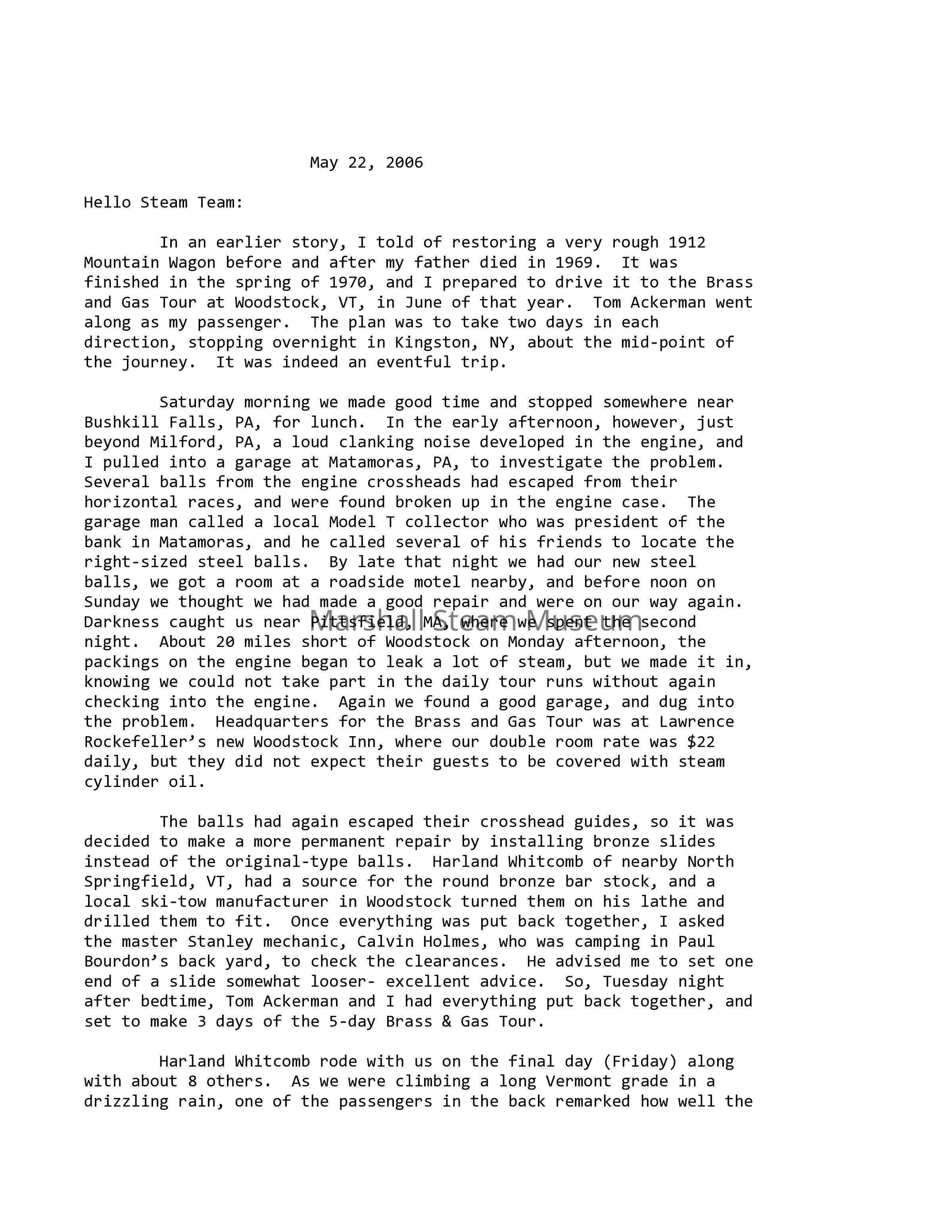 In an earlier story, I told of restoring a very rough 1912 Mountain Wagon before and after my father died in 1969. It was finished in the spring of 1970, and I prepared to drive it to the Brass and Gas Tour at Woodstock, VT, in June of that year. Tom Ackerman went along as my passenger. The plan was to take two days in each direction, stopping overnight in Kingston, NY, about the mid-point of the journey. It was indeed an eventful trip.