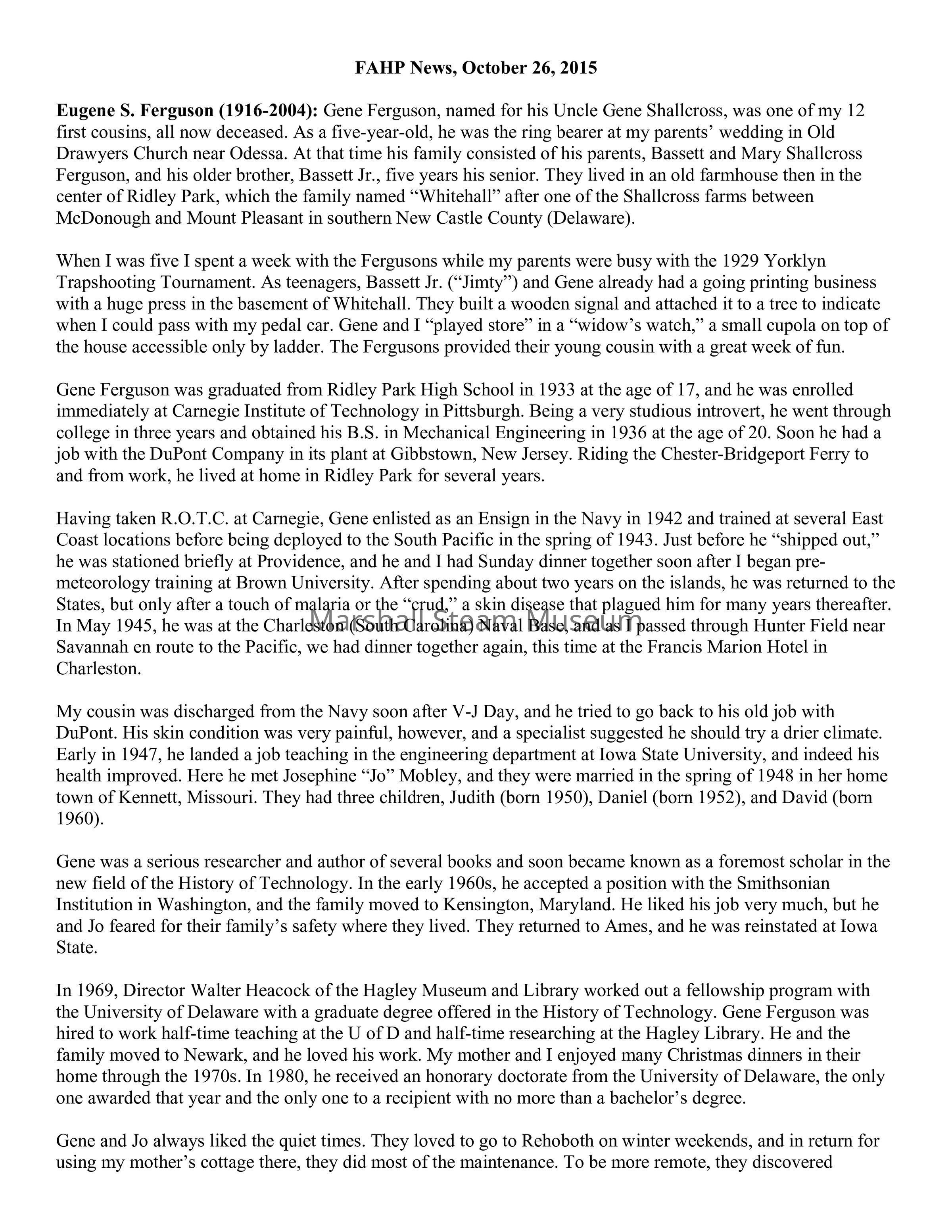 Eugene S. Ferguson (1916-2004): Gene Ferguson, named for his Uncle Gene Shallcross, was one of my 12 first cousins, all now deceased. As a five-year-old, he was the ring bearer at my parents’ wedding in Old Drawyers Church near Odessa. At that time his family consisted of his parents, Bassett and Mary Shallcross Ferguson, and his older brother, Bassett Jr., five years his senior. They lived in an old farmhouse then in the center of Ridley Park, which the family named “Whitehall” after one of the Shallcross farms between McDonough and Mount Pleasant in southern New Castle County (Delaware).