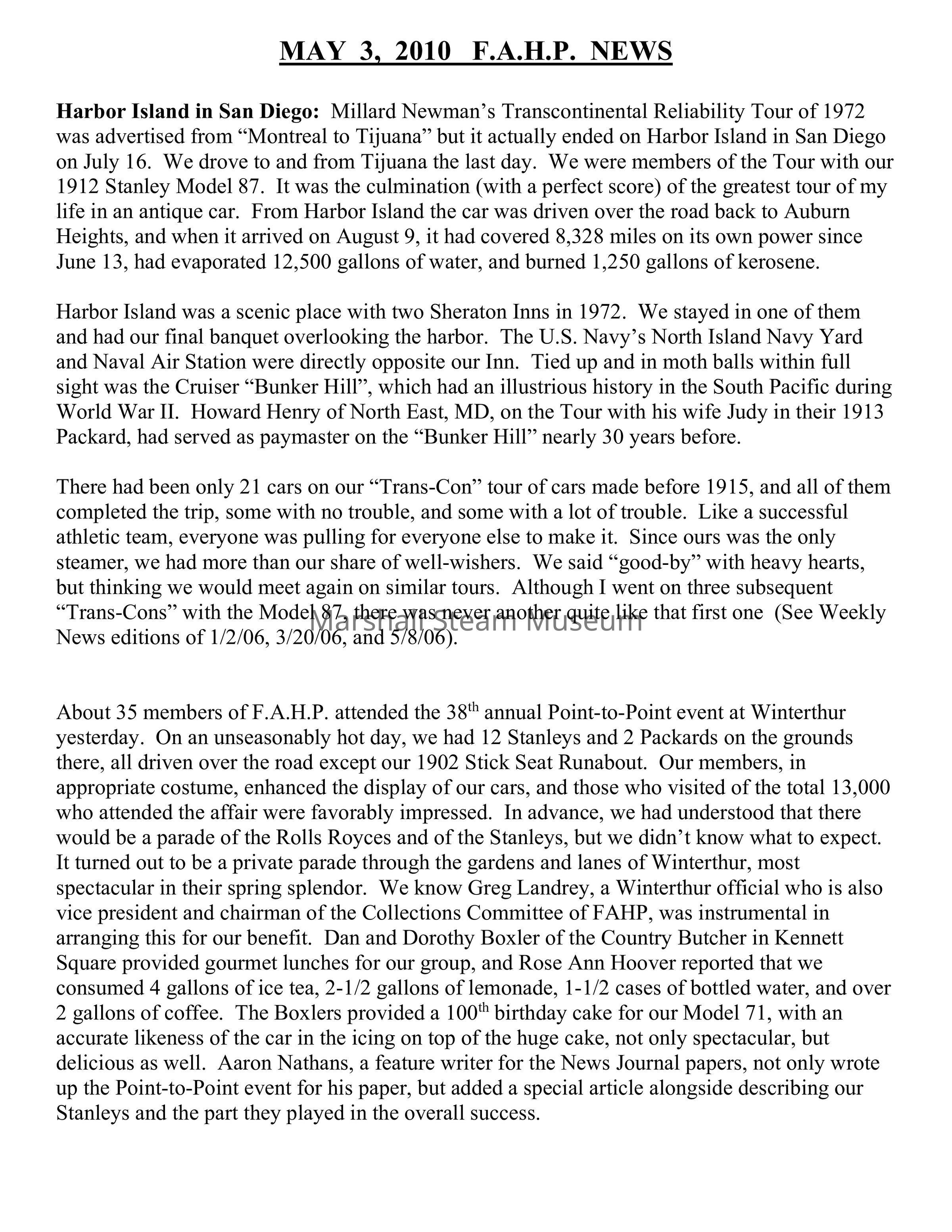 About 35 members of F.A.H.P. attended the 38th annual Point-to-Point event at Winterthur yesterday. On an unseasonably hot day, we had 12 Stanleys and 2 Packards on the grounds there, all driven over the road except our 1902 Stick Seat Runabout. Our members, in appropriate costume, enhanced the display of our cars, and those who visited of the total 13,000 who attended the affair were favorably impressed. In advance, we had understood that there would be a parade of the Rolls Royces and of the Stanleys, but we didn’t know what to expect. It turned out to be a private parade through the gardens and lanes of Winterthur, most spectacular in their spring splendor. We know Greg Landrey, a Winterthur official who is also vice president and chairman of the Collections Committee of FAHP, was instrumental in arranging this for our benefit. Dan and Dorothy Boxler of the Country Butcher in Kennett Square provided gourmet lunches for our group, and Rose Ann Hoover reported that we consumed 4 gallons of ice tea, 2-1/2 gallons of lemonade, 1-1/2 cases of bottled water, and over 2 gallons of coffee. The Boxlers provided a 100th birthday cake for our Model 71, with an accurate likeness of the car in the icing on top of the huge cake, not only spectacular, but delicious as well. Aaron Nathans, a feature writer for the News Journal papers, not only wrote up the Point-to-Point event for his paper, but added a special article alongside describing our Stanleys and the part they played in the overall success.