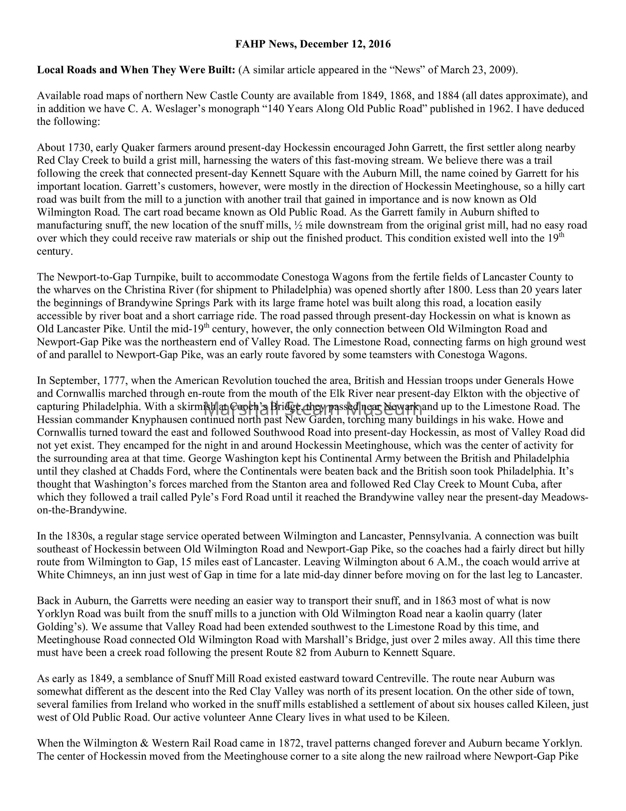 Available road maps of northern New Castle County are available from 1849, 1868, and 1884 (all dates approximate), and in addition we have C. A. Weslager’s monograph “140 Years Along Old Public Road” published in 1962. I have deduced the following: