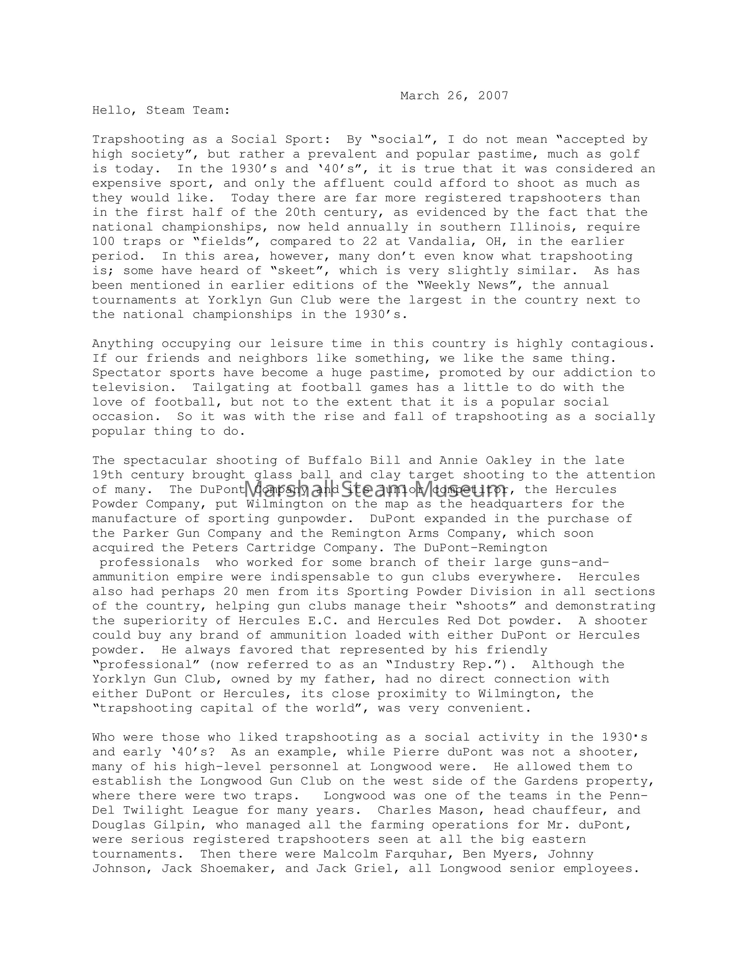 Trapshooting as a Social Sport: By “social”, I do not mean “accepted by high society”, but rather a prevalent and popular pastime, much as golf is today. In the 1930’s and ‘40’s”, it is true that it was considered an expensive sport, and only the affluent could afford to shoot as much as they would like. Today there are far more registered trapshooters than in the first half of the 20th century, as evidenced by the fact that the national championships, now held annually in southern Illinois, require 100 traps or “fields”, compared to 22 at Vandalia, OH, in the earlier period. In this area, however, many don’t even know what trapshooting is; some have heard of “skeet”, which is very slightly similar. As has been mentioned in earlier editions of the “Weekly News”, the annual tournaments at Yorklyn Gun Club were the largest in the country next to the national championships in the 1930’s.