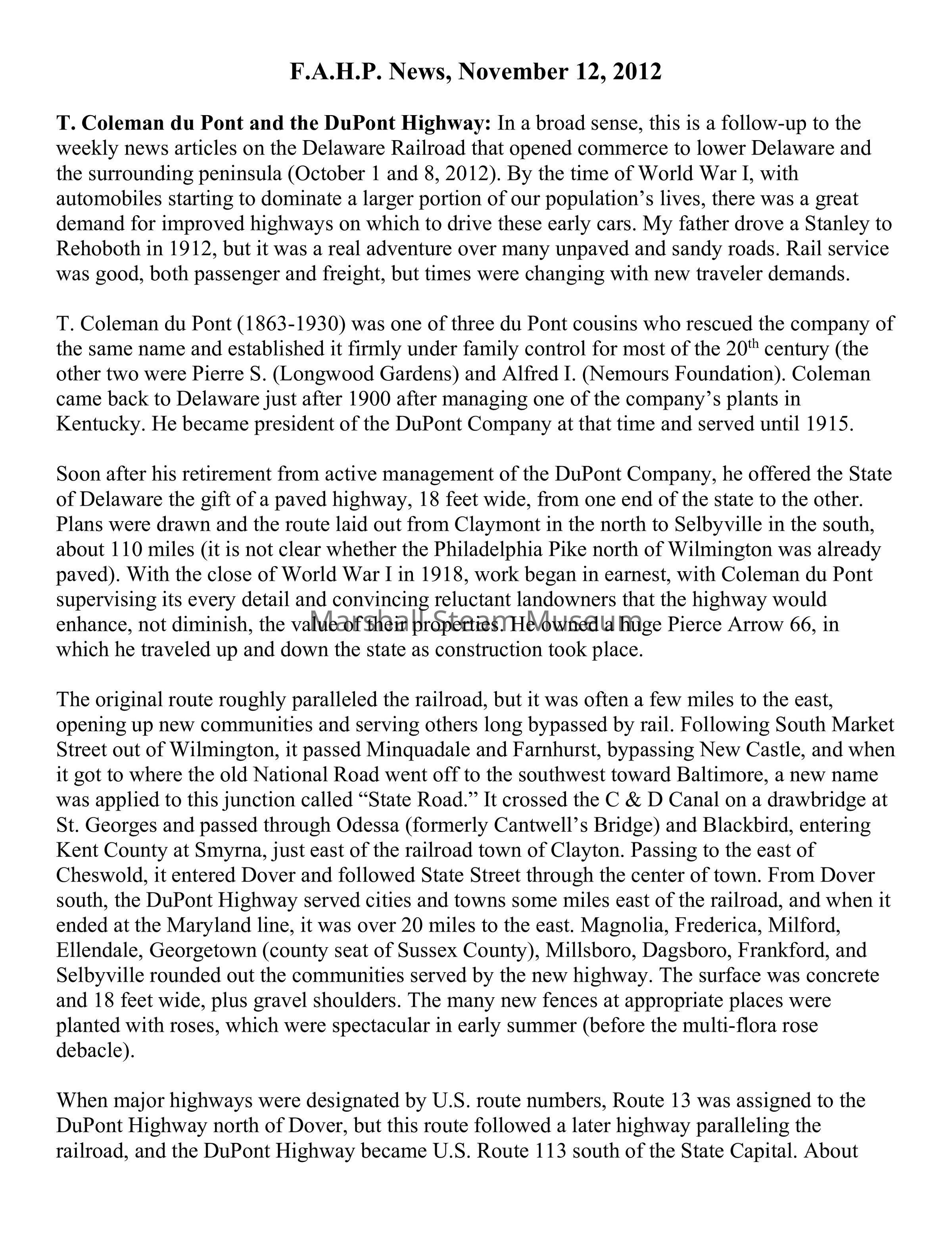 T. Coleman du Pont and the DuPont Highway: In a broad sense, this is a follow-up to the weekly news articles on the Delaware Railroad that opened commerce to lower Delaware and the surrounding peninsula (October 1 and 8, 2012). By the time of World War I, with automobiles starting to dominate a larger portion of our population’s lives, there was a great demand for improved highways on which to drive these early cars. My father drove a Stanley to Rehoboth in 1912, but it was a real adventure over many unpaved and sandy roads. Rail service was good, both passenger and freight, but times were changing with new traveler demands.