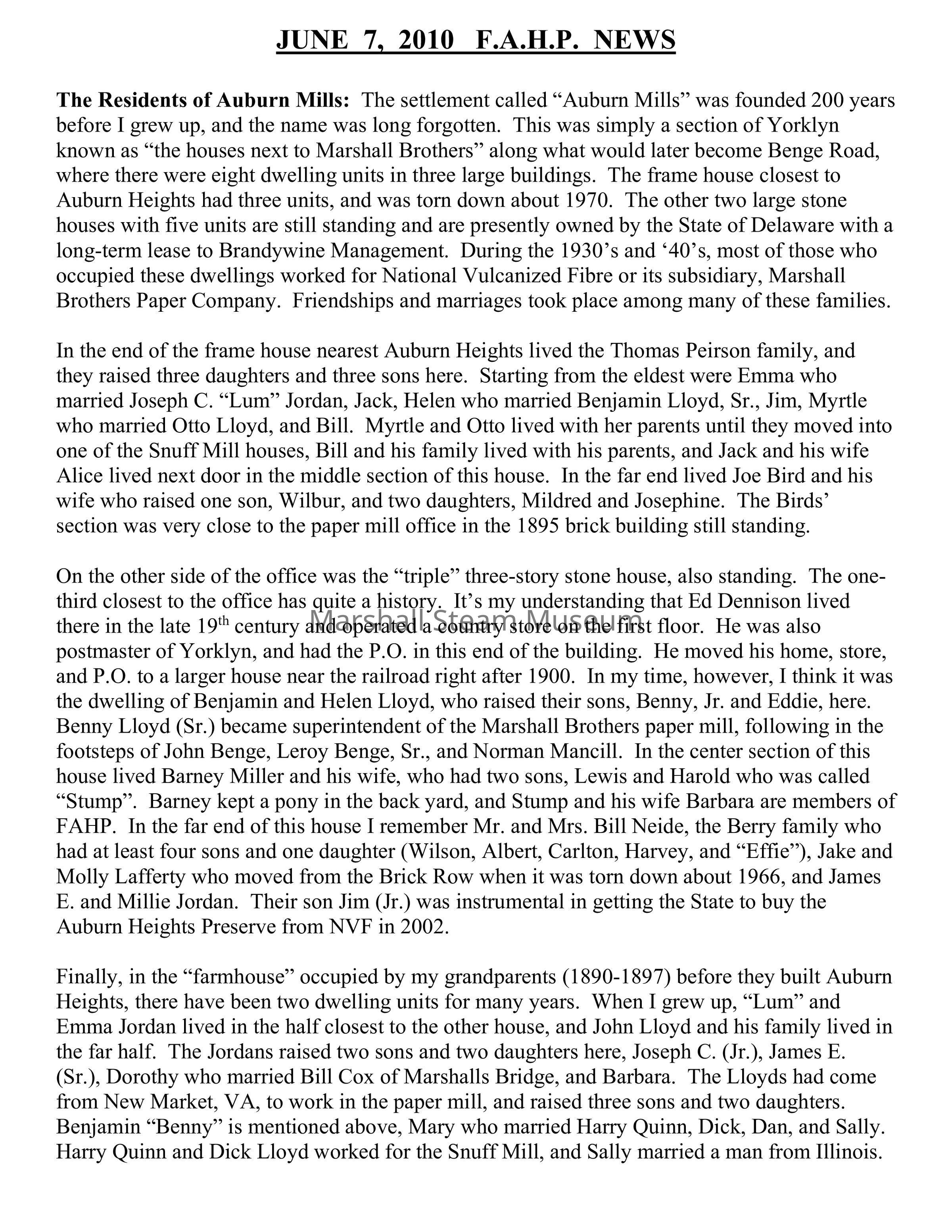 The Residents of Auburn Mills: The settlement called “Auburn Mills” was founded 200 years before I grew up, and the name was long forgotten. This was simply a section of Yorklyn known as “the houses next to Marshall Brothers” along what would later become Benge Road, where there were eight dwelling units in three large buildings. The frame house closest to Auburn Heights had three units, and was torn down about 1970. The other two large stone houses with five units are still standing and are presently owned by the State of Delaware with a long-term lease to Brandywine Management. During the 1930’s and ‘40’s, most of those who occupied these dwellings worked for National Vulcanized Fibre or its subsidiary, Marshall Brothers Paper Company. Friendships and marriages took place among many of these families.