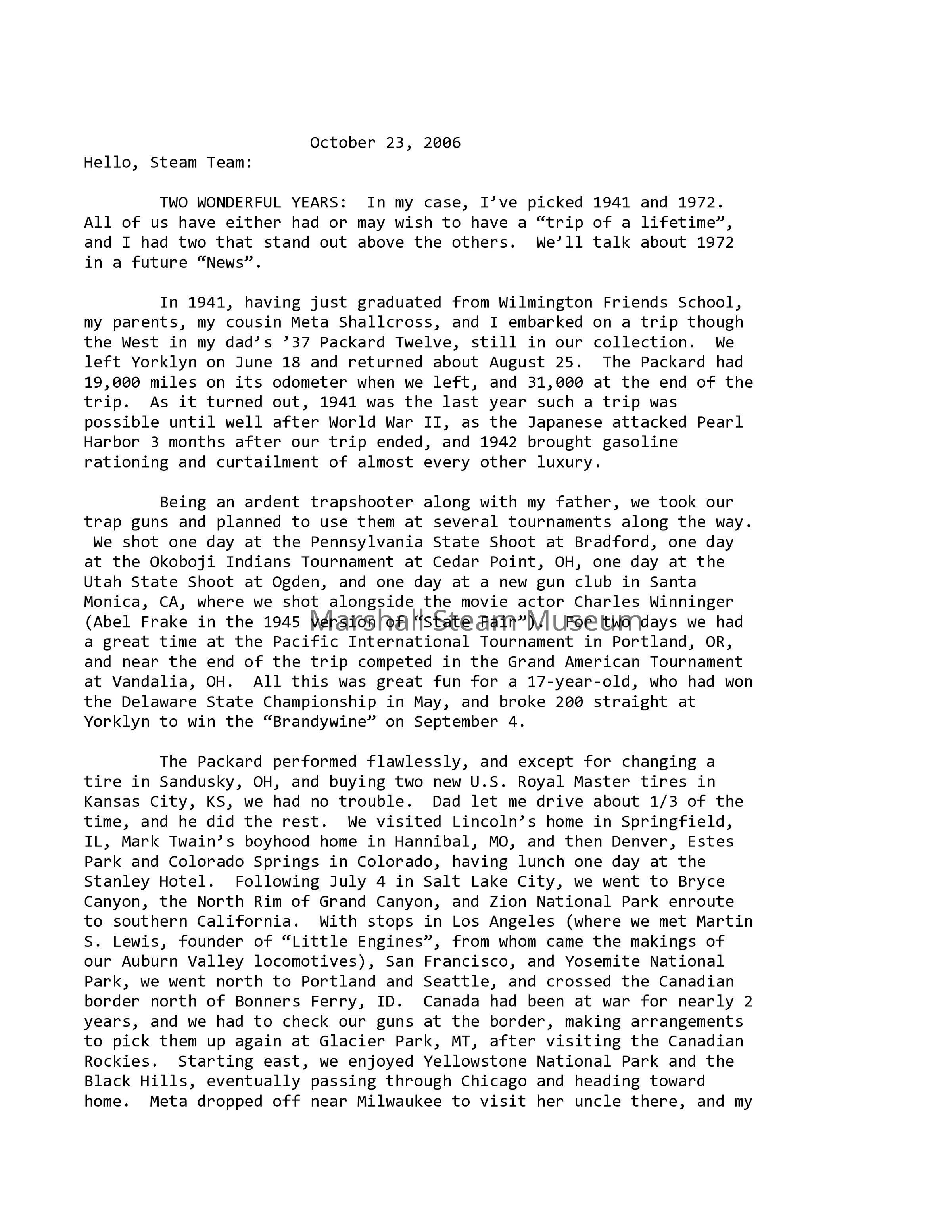 The Packard performed flawlessly, and except for changing a tire in Sandusky, OH, and buying two new U.S. Royal Master tires in Kansas City, KS, we had no trouble. Dad let me drive about 1/3 of the time, and he did the rest. We visited Lincoln’s home in Springfield, IL, Mark Twain’s boyhood home in Hannibal, MO, and then Denver, Estes Park and Colorado Springs in Colorado, having lunch one day at the Stanley Hotel. Following July 4 in Salt Lake City, we went to Bryce Canyon, the North Rim of Grand Canyon, and Zion National Park enroute to southern California. With stops in Los Angeles (where we met Martin S. Lewis, founder of “Little Engines”, from whom came the makings of our Auburn Valley locomotives), San Francisco, and Yosemite National Park, we went north to Portland and Seattle, and crossed the Canadian border north of Bonners Ferry, ID. Canada had been at war for nearly 2 years, and we had to check our guns at the border, making arrangements to pick them up again at Glacier Park, MT, after visiting the Canadian Rockies. Starting east, we enjoyed Yellowstone National Park and the Black Hills, eventually passing through Chicago and heading toward home. Meta dropped off near Milwaukee to visit her uncle there, and my mother took the train home from Dayton, OH, as she was not particularly interested in our trapshooting activities at nearby Vandalia. Bringing two shooters home from the Grand American (many in those days either went by train or begged rides), it was my dad’s very first trip on the new Pennsylvania Turnpike, the original section of which had opened on Labor Day, 1940. The Packard averaged 9.75 miles per gallon for the trip, and once we put $7 worth of gasoline in the tank at once! Rates at the best hotels, where my father liked to stay, averaged about $7.50 double, per night. Breakfasts were usually 25 to 30 cents, lunches 40 to 50 cents, and 5-course dinners never more than $1.50. It turned out this was the only trip my parents made west of Oklahoma-Texas during their lifetimes, but it was a good one.