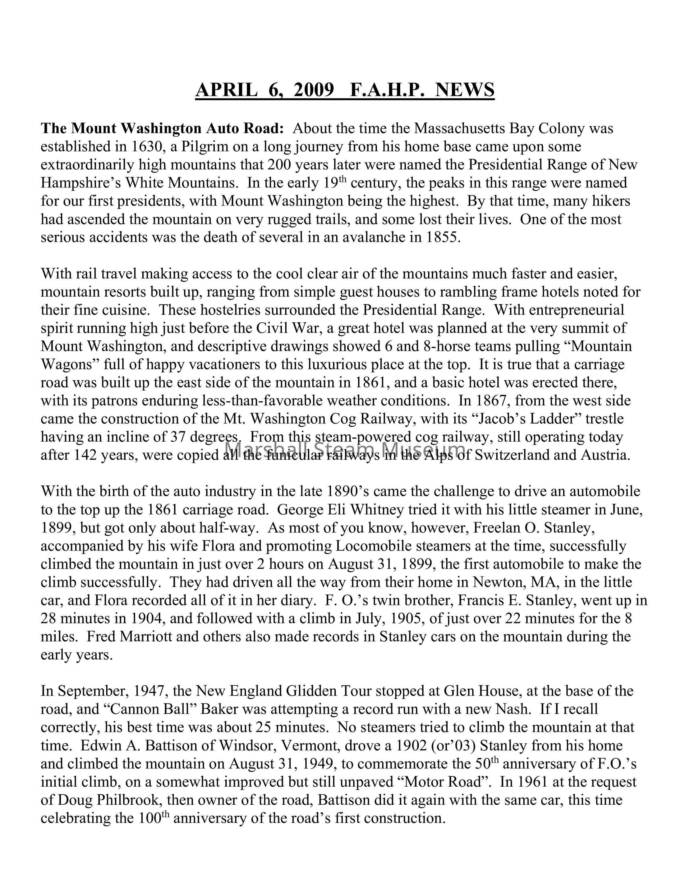 With the birth of the auto industry in the late 1890’s came the challenge to drive an automobile to the top up the 1861 carriage road. George Eli Whitney tried it with his little steamer in June, 1899, but got only about half-way. As most of you know, however, Freelan O. Stanley, accompanied by his wife Flora and promoting Locomobile steamers at the time, successfully climbed the mountain in just over 2 hours on August 31, 1899, the first automobile to make the climb successfully. They had driven all the way from their home in Newton, MA, in the little car, and Flora recorded all of it in her diary. F. O.’s twin brother, Francis E. Stanley, went up in 28 minutes in 1904, and followed with a climb in July, 1905, of just over 22 minutes for the 8 miles. Fred Marriott and others also made records in Stanley cars on the mountain during the early years.