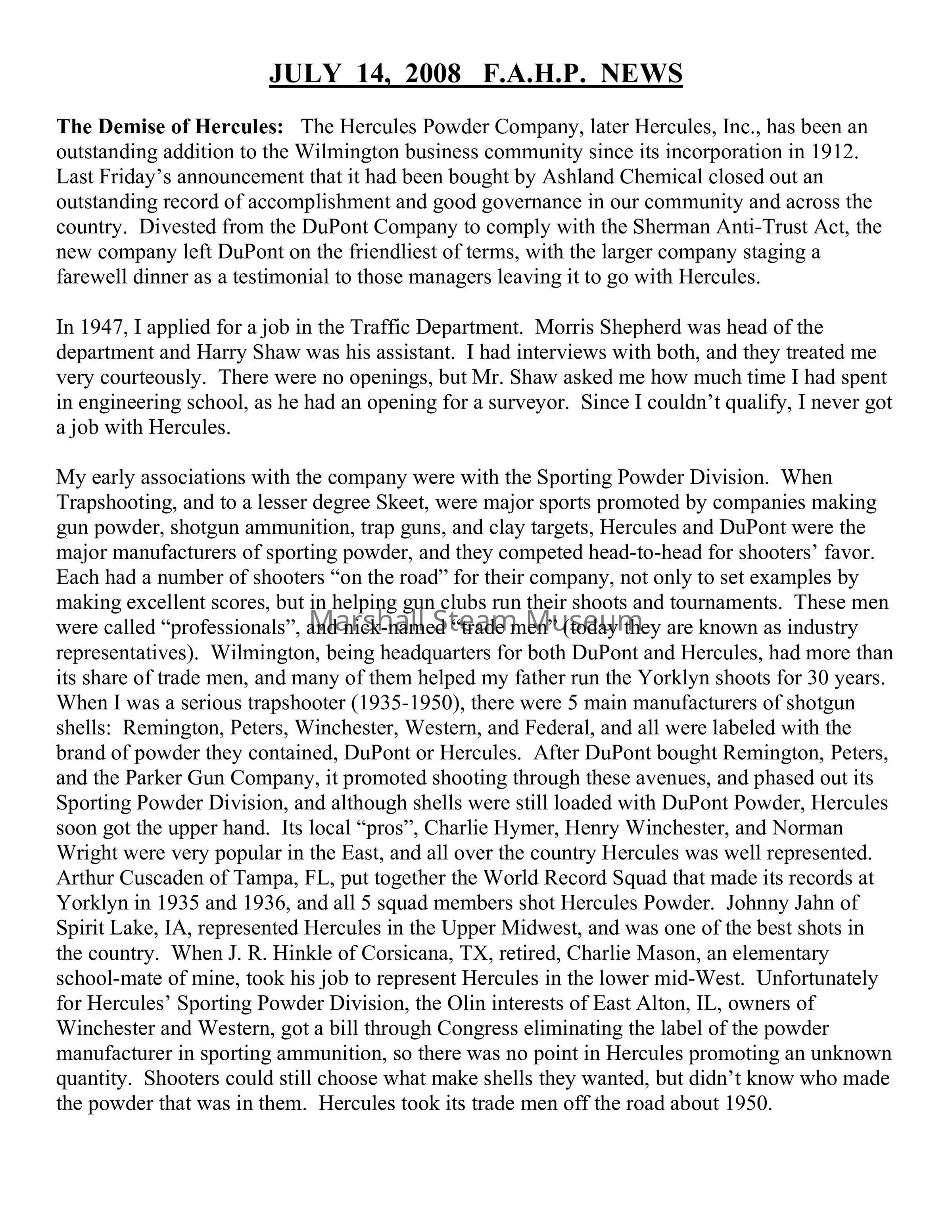 The Demise of Hercules: The Hercules Powder Company, later Hercules, Inc., has been an outstanding addition to the Wilmington business community since its incorporation in 1912. Last Friday’s announcement that it had been bought by Ashland Chemical closed out an outstanding record of accomplishment and good governance in our community and across the country. Divested from the DuPont Company to comply with the Sherman Anti-Trust Act, the new company left DuPont on the friendliest of terms, with the larger company staging a farewell dinner as a testimonial to those managers leaving it to go with Hercules.
