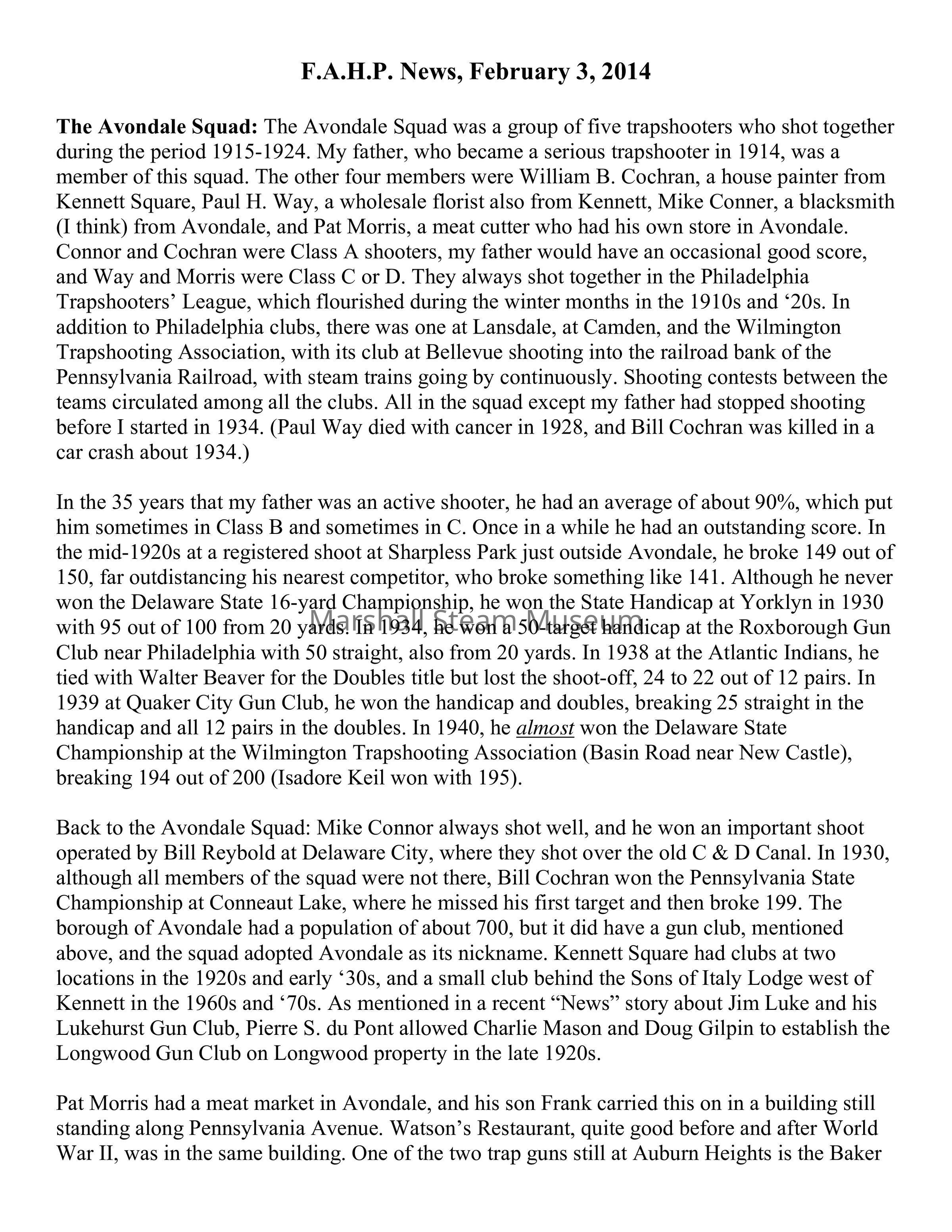 The Avondale Squad: The Avondale Squad was a group of five trapshooters who shot together during the period 1915-1924. My father, who became a serious trapshooter in 1914, was a member of this squad. The other four members were William B. Cochran, a house painter from Kennett Square, Paul H. Way, a wholesale florist also from Kennett, Mike Conner, a blacksmith (I think) from Avondale, and Pat Morris, a meat cutter who had his own store in Avondale. Connor and Cochran were Class A shooters, my father would have an occasional good score, and Way and Morris were Class C or D. They always shot together in the Philadelphia Trapshooters’ League, which flourished during the winter months in the 1910s and ‘20s. In addition to Philadelphia clubs, there was one at Lansdale, at Camden, and the Wilmington Trapshooting Association, with its club at Bellevue shooting into the railroad bank of the Pennsylvania Railroad, with steam trains going by continuously. Shooting contests between the teams circulated among all the clubs. All in the squad except my father had stopped shooting before I started in 1934. (Paul Way died with cancer in 1928, and Bill Cochran was killed in a car crash about 1934.)
