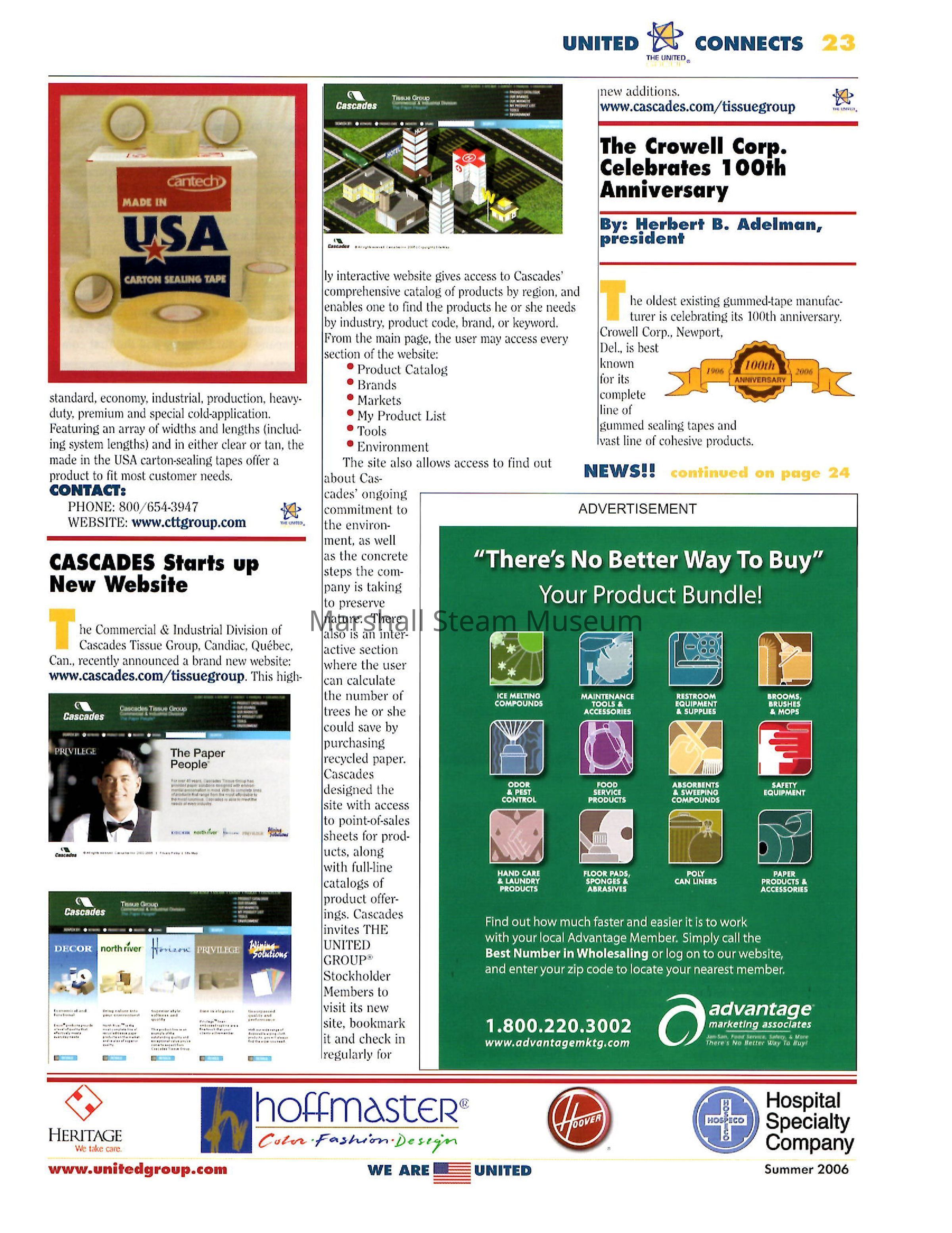 Article from United Connects, a newsletter published by the United Group purchasing group, highlighting the 100th anniversary of Crowell Tape Corporation, Summer 2006 issue. Crowell was likely a member of this buying group.Collection