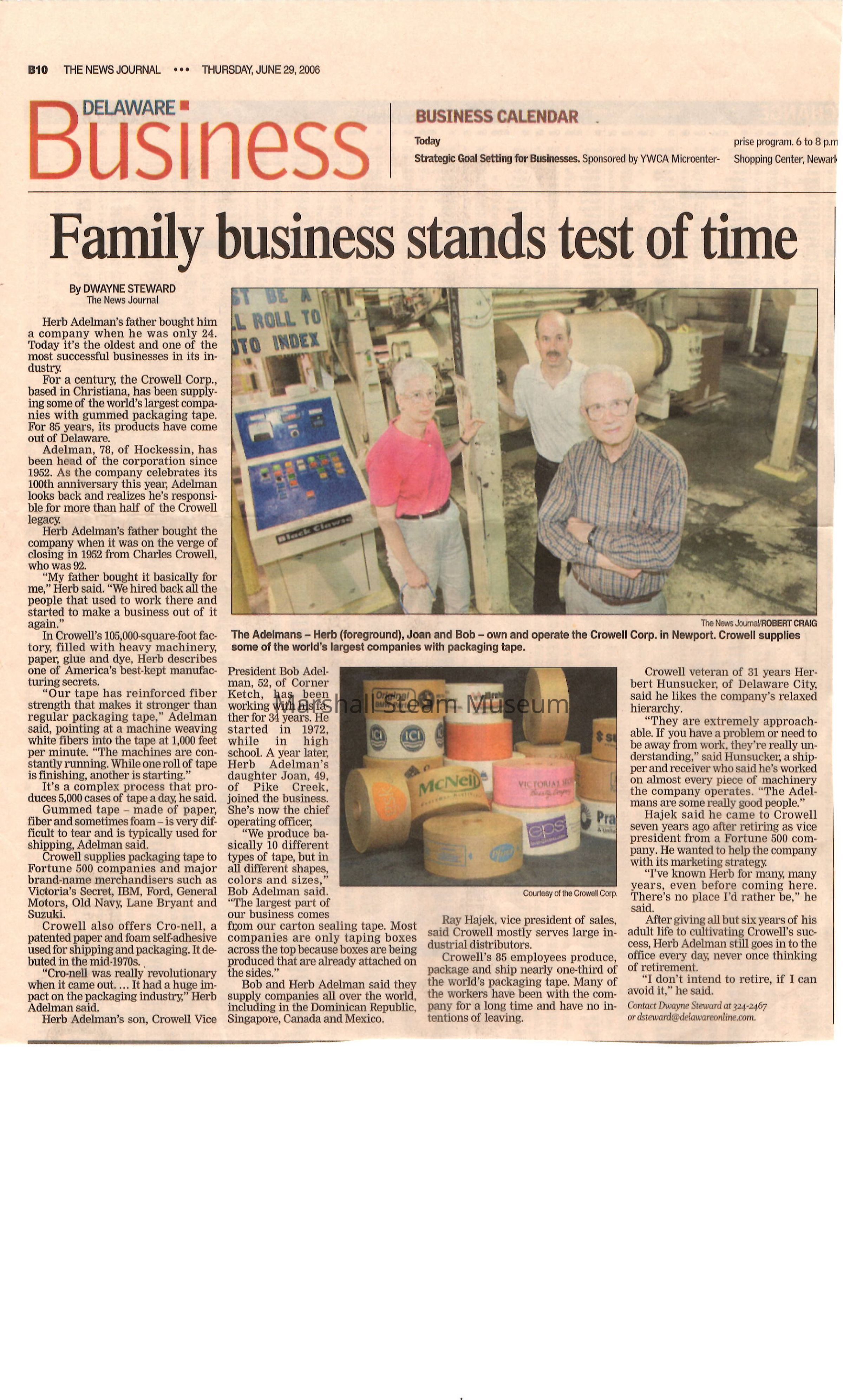 Clipping of a Wilmington (DE) News Journal article highlighting the Adelman family business with a photo of Herb Adelman, Robert Adelman and Joan Adelman, June 2006.General Notes