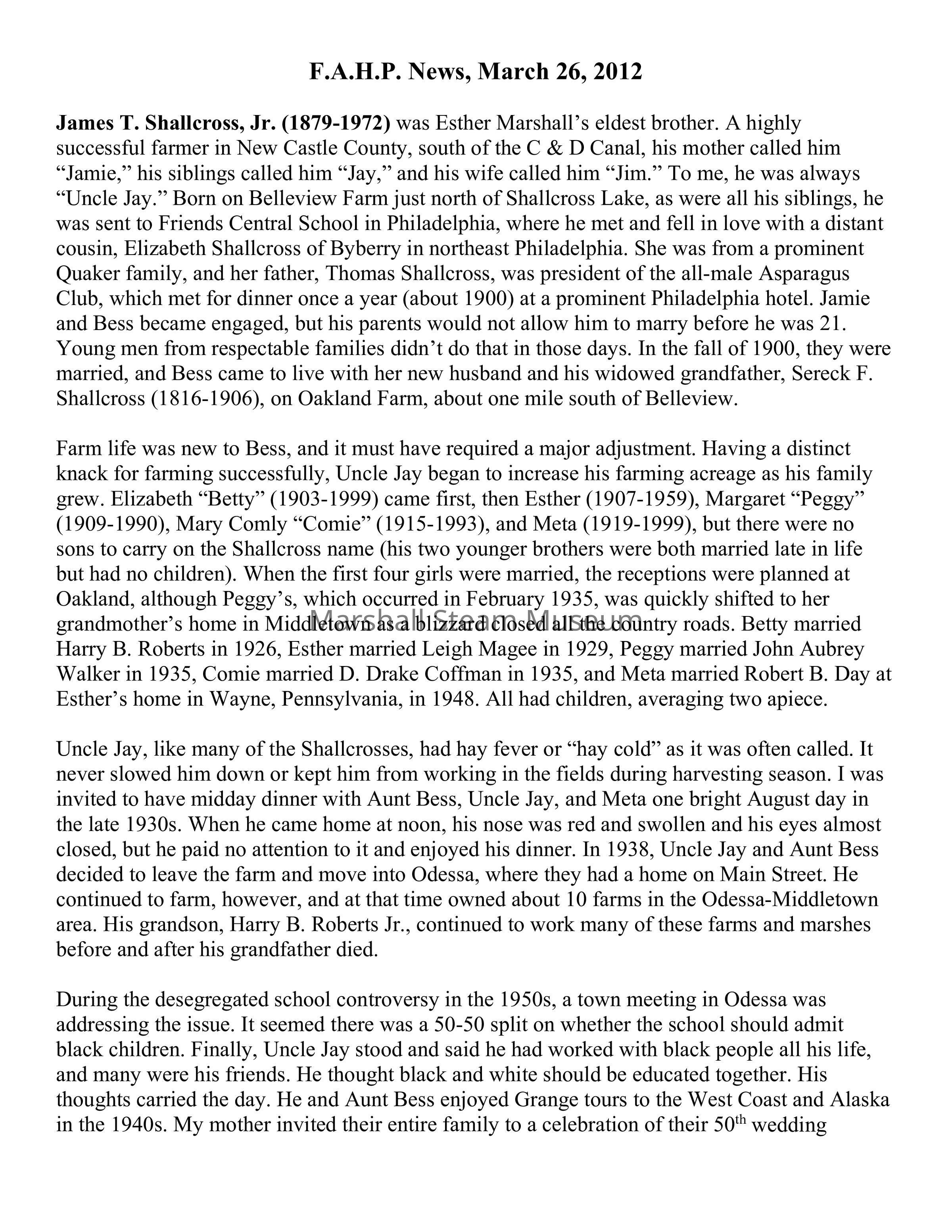 Uncle Jay, like many of the Shallcrosses, had hay fever or “hay cold” as it was often called. It never slowed him down or kept him from working in the fields during harvesting season. I was invited to have midday dinner with Aunt Bess, Uncle Jay, and Meta one bright August day in the late 1930s. When he came home at noon, his nose was red and swollen and his eyes almost closed, but he paid no attention to it and enjoyed his dinner. In 1938, Uncle Jay and Aunt Bess decided to leave the farm and move into Odessa, where they had a home on Main Street. He continued to farm, however, and at that time owned about 10 farms in the Odessa-Middletown area. His grandson, Harry B. Roberts Jr., continued to work many of these farms and marshes before and after his grandfather died.