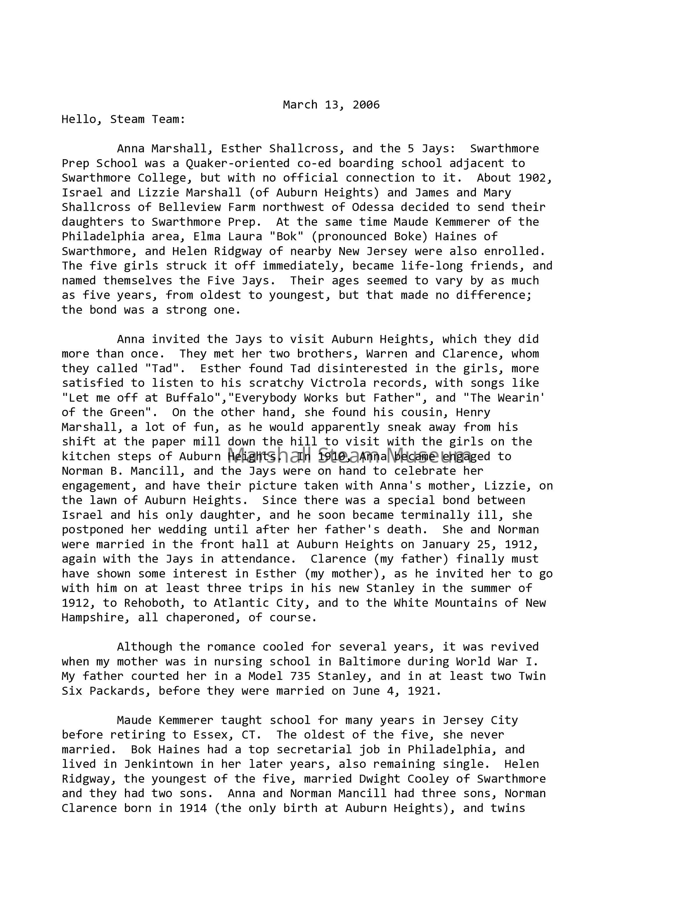 Anna invited the Jays to visit Auburn Heights, which they did more than once. They met her two brothers, Warren and Clarence, whom they called "Tad". Esther found Tad disinterested in the girls, more satisfied to listen to his scratchy Victrola records, with songs like "Let me off at Buffalo", "Everybody Works but Father", and "The Wearin' of the Green". On the other hand, she found his cousin, Henry Marshall, a lot of fun, as he would apparently sneak away from his shift at the paper mill down the hill to visit with the girls on the kitchen steps of Auburn Heights. In 1910, Anna became engaged to Norman B. Mancill, and the Jays were on hand to celebrate her engagement, and have their picture taken with Anna's mother, Lizzie, on the lawn of Auburn Heights. Since there was a special bond between Israel and his only daughter, and he soon became terminally ill, she postponed her wedding until after her father's death. She and Norman were married in the front hall at Auburn Heights on January 25, 1912, again with the Jays in attendance. Clarence (my father) finally must have shown some interest in Esther (my mother), as he invited her to go with him on at least three trips in his new Stanley in the summer of 1912, to Rehoboth, to Atlantic City, and to the White Mountains of New Hampshire, all chaperoned, of course.