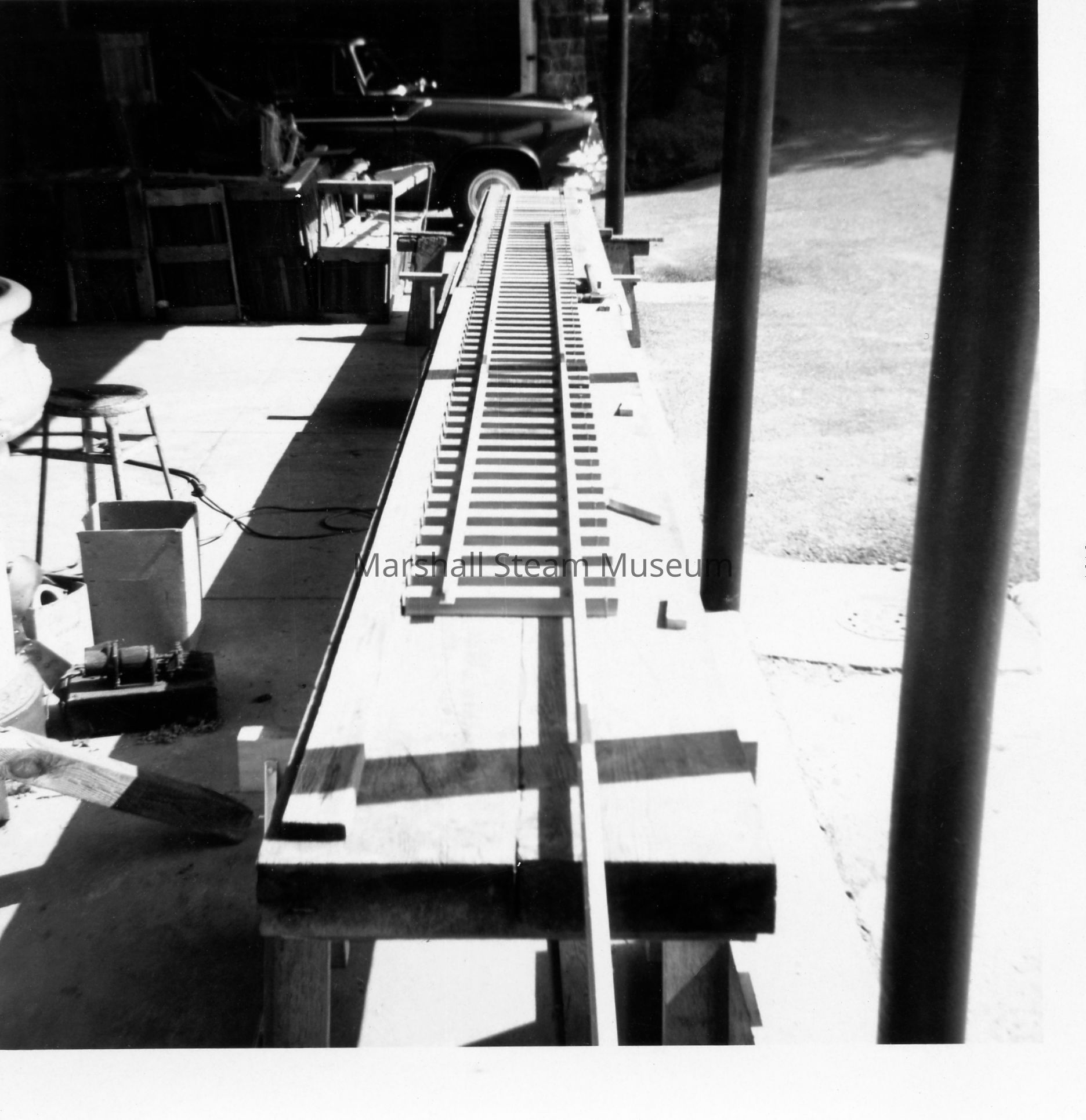 Backwriting: "Track sections were assembled under the shed at the carriage house. While the rail lengths were 10 feet, the joints were staggered so the lengths were actually about 15 feet each."Photograph Details