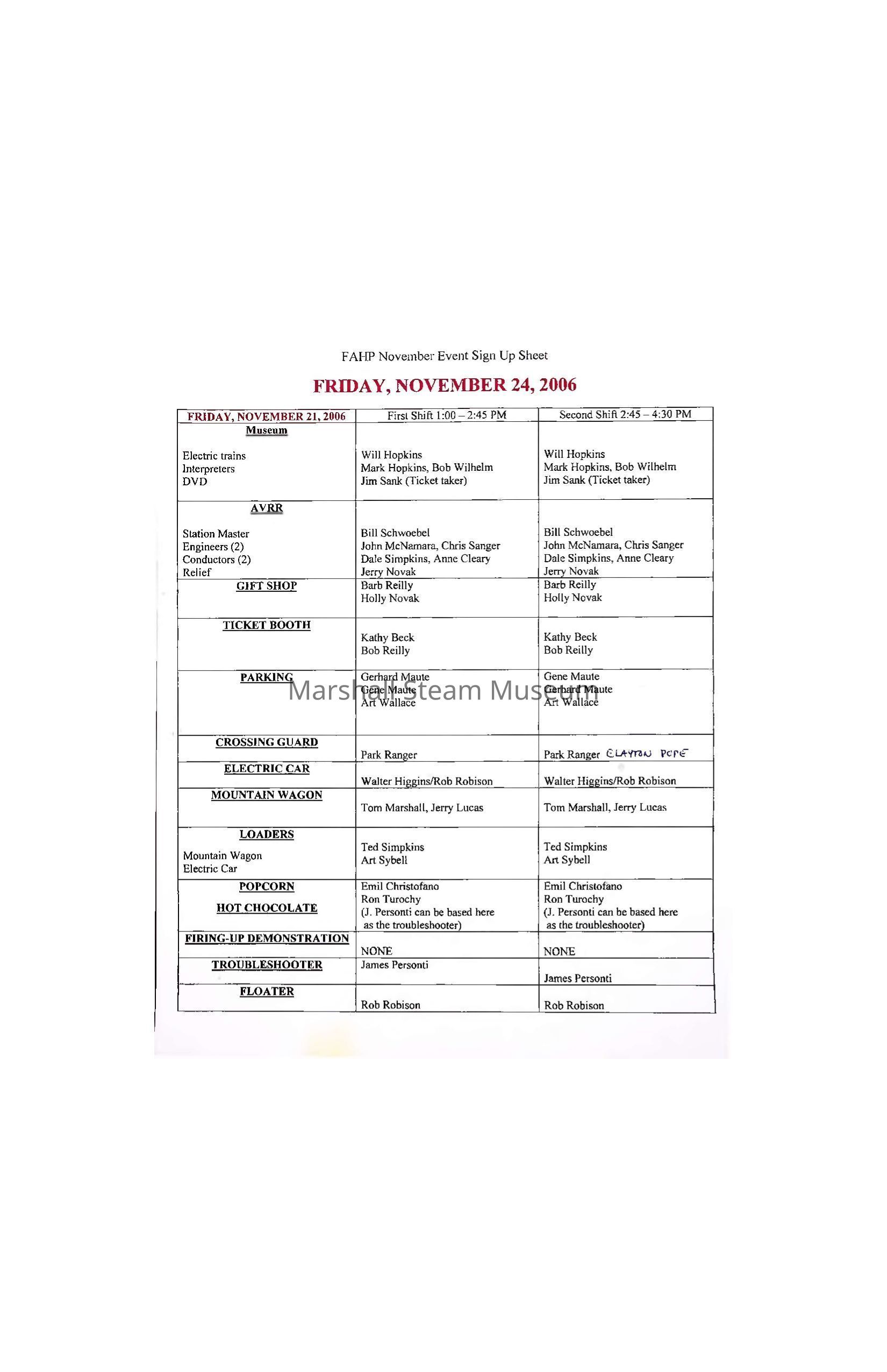 2006 - Thanksgiving Steamin' Day volunteer sign-up sheets