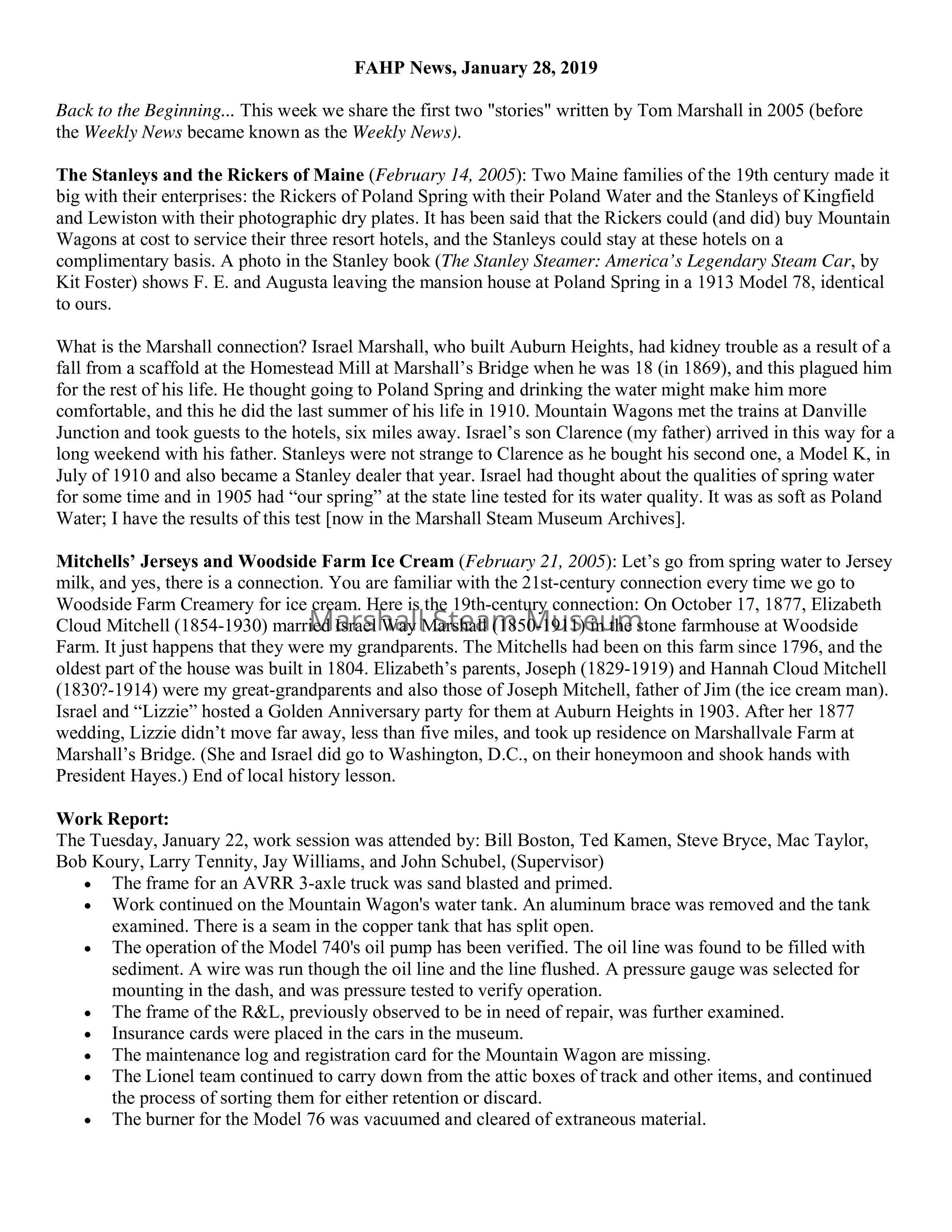 What is the Marshall connection? Israel Marshall, who built Auburn Heights, had kidney trouble as a result of a fall from a scaffold at the Homestead Mill at Marshall’s Bridge when he was 18 (in 1869), and this plagued him for the rest of his life. He thought going to Poland Spring and drinking the water might make him more comfortable, and this he did the last summer of his life in 1910. Mountain Wagons met the trains at Danville Junction and took guests to the hotels, six miles away. Israel’s son Clarence (my father) arrived in this way for a long weekend with his father. Stanleys were not strange to Clarence as he bought his second one, a Model K, in July of 1910 and also became a Stanley dealer that year. Israel had thought about the qualities of spring water for some time and in 1905 had “our spring” at the state line tested for its water quality. It was as soft as Poland Water; I have the results of this test [now in the Marshall Steam Museum Archives].