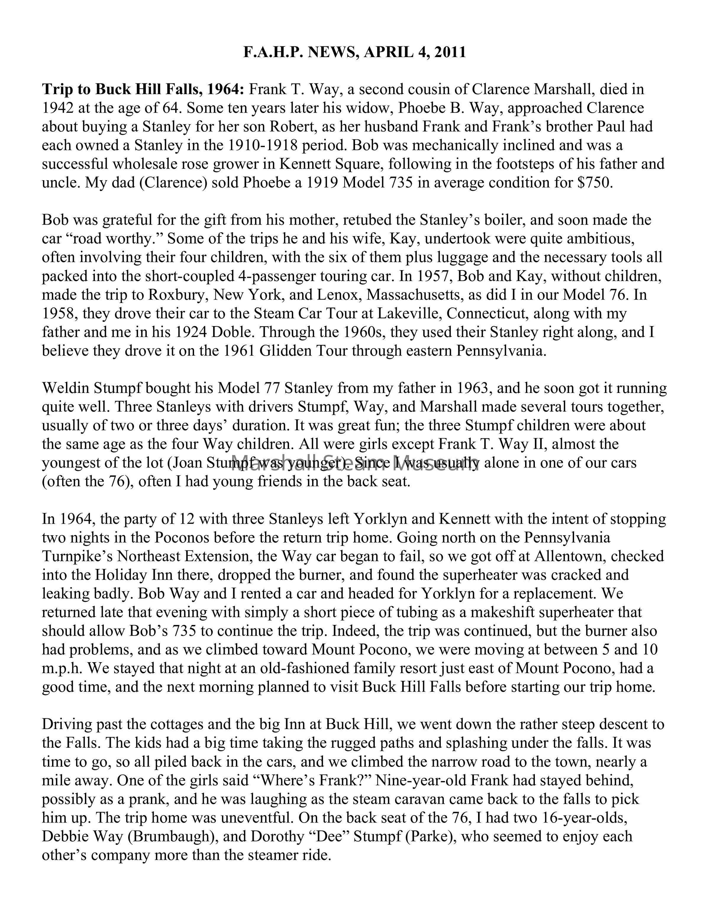 Trip to Buck Hill Falls, 1964: Frank T. Way, a second cousin of Clarence Marshall, died in 1942 at the age of 64. Some ten years later his widow, Phoebe B. Way, approached Clarence about buying a Stanley for her son Robert, as her husband Frank and Frank’s brother Paul had each owned a Stanley in the 1910-1918 period. Bob was mechanically inclined and was a successful wholesale rose grower in Kennett Square, following in the footsteps of his father and uncle. My dad (Clarence) sold Phoebe a 1919 Model 735 in average condition for $750.