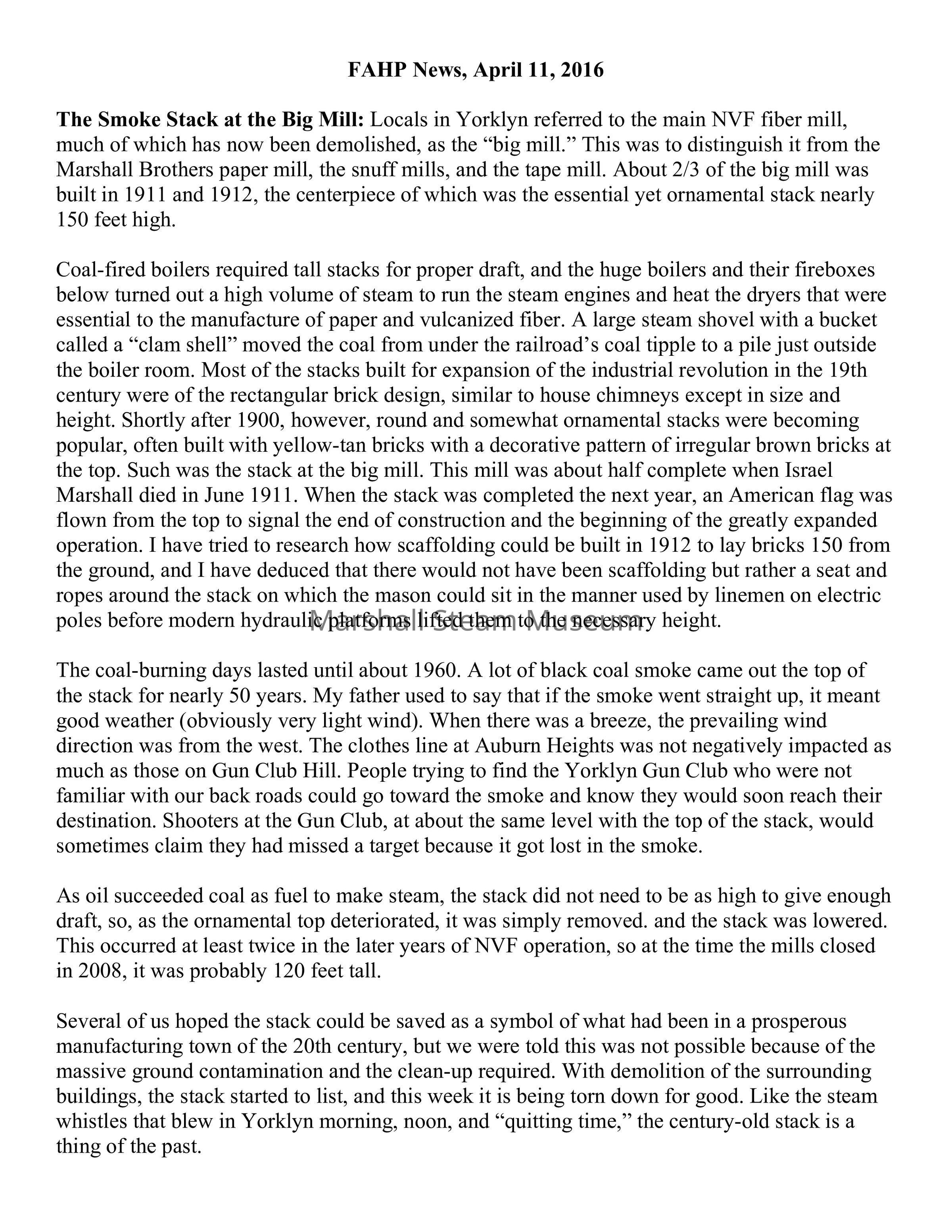 The Smoke Stack at the Big Mill: Locals in Yorklyn referred to the main NVF fiber mill, much of which has now been demolished, as the “big mill.” This was to distinguish it from the Marshall Brothers paper mill, the snuff mills, and the tape mill. About 2/3 of the big mill was built in 1911 and 1912, the centerpiece of which was the essential yet ornamental stack nearly 150 feet high.