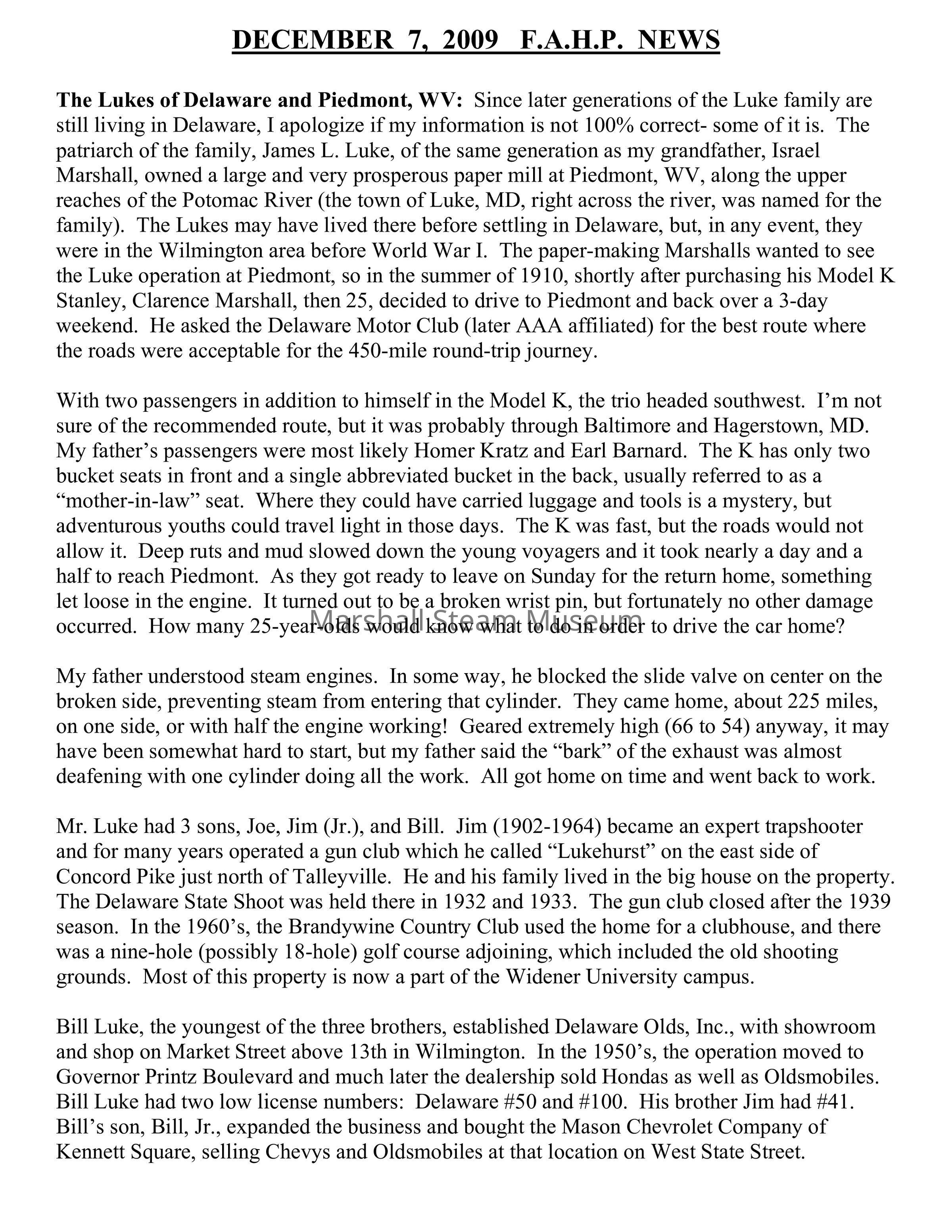 The Lukes of Delaware and Piedmont, WV: Since later generations of the Luke family are still living in Delaware, I apologize if my information is not 100% correct- some of it is. The patriarch of the family, James L. Luke, of the same generation as my grandfather, Israel Marshall, owned a large and very prosperous paper mill at Piedmont, WV, along the upper reaches of the Potomac River (the town of Luke, MD, right across the river, was named for the family). The Lukes may have lived there before settling in Delaware, but, in any event, they were in the Wilmington area before World War I. The paper-making Marshalls wanted to see the Luke operation at Piedmont, so in the summer of 1910, shortly after purchasing his Model K Stanley, Clarence Marshall, then 25, decided to drive to Piedmont and back over a 3-day weekend. He asked the Delaware Motor Club (later AAA affiliated) for the best route where the roads were acceptable for the 450-mile round-trip journey.