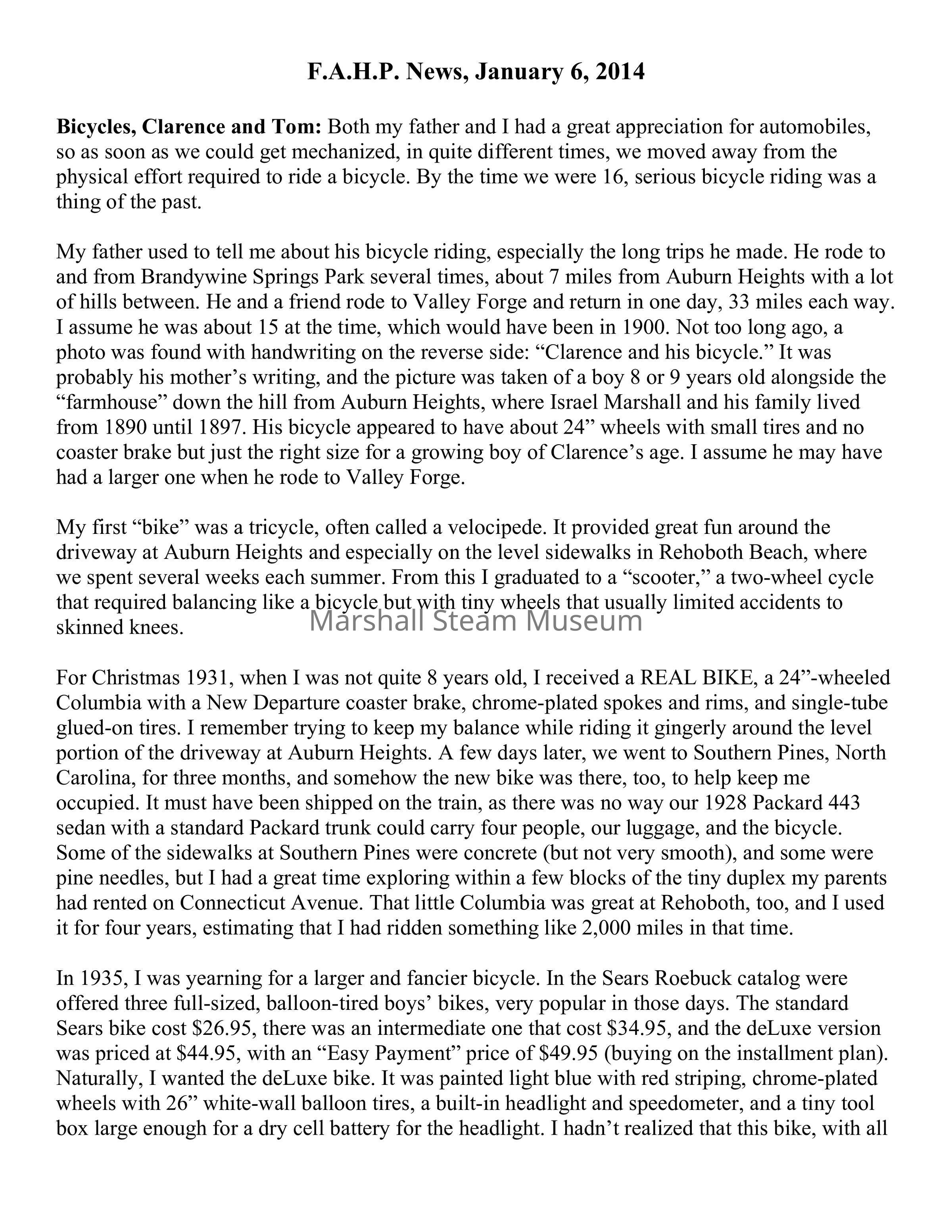 My father used to tell me about his bicycle riding, especially the long trips he made. He rode to and from Brandywine Springs Park several times, about 7 miles from Auburn Heights with a lot of hills between. He and a friend rode to Valley Forge and return in one day, 33 miles each way. I assume he was about 15 at the time, which would have been in 1900. Not too long ago, a photo was found with handwriting on the reverse side: “Clarence and his bicycle.” It was probably his mother’s writing, and the picture was taken of a boy 8 or 9 years old alongside the “farmhouse” down the hill from Auburn Heights, where Israel Marshall and his family lived from 1890 until 1897. His bicycle appeared to have about 24” wheels with small tires and no coaster brake but just the right size for a growing boy of Clarence’s age. I assume he may have had a larger one when he rode to Valley Forge.