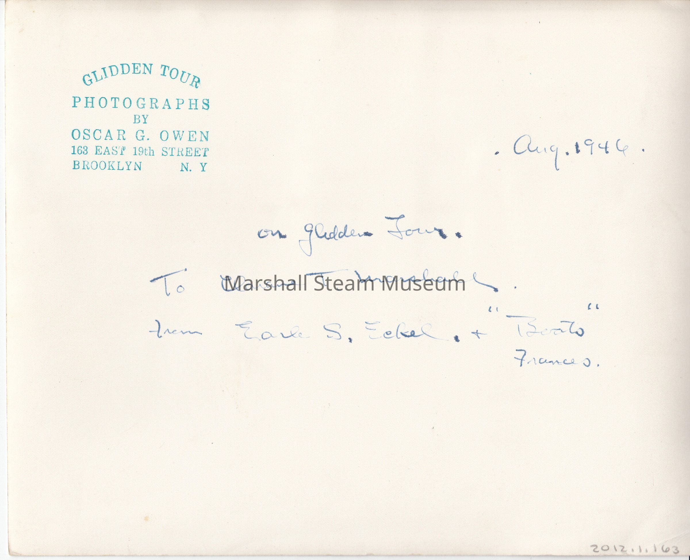 Back Writing:"On Glidden Tour. To: Clarence T. Marshall From: Earle S. Eckel + [illeg] Aug. 1946"