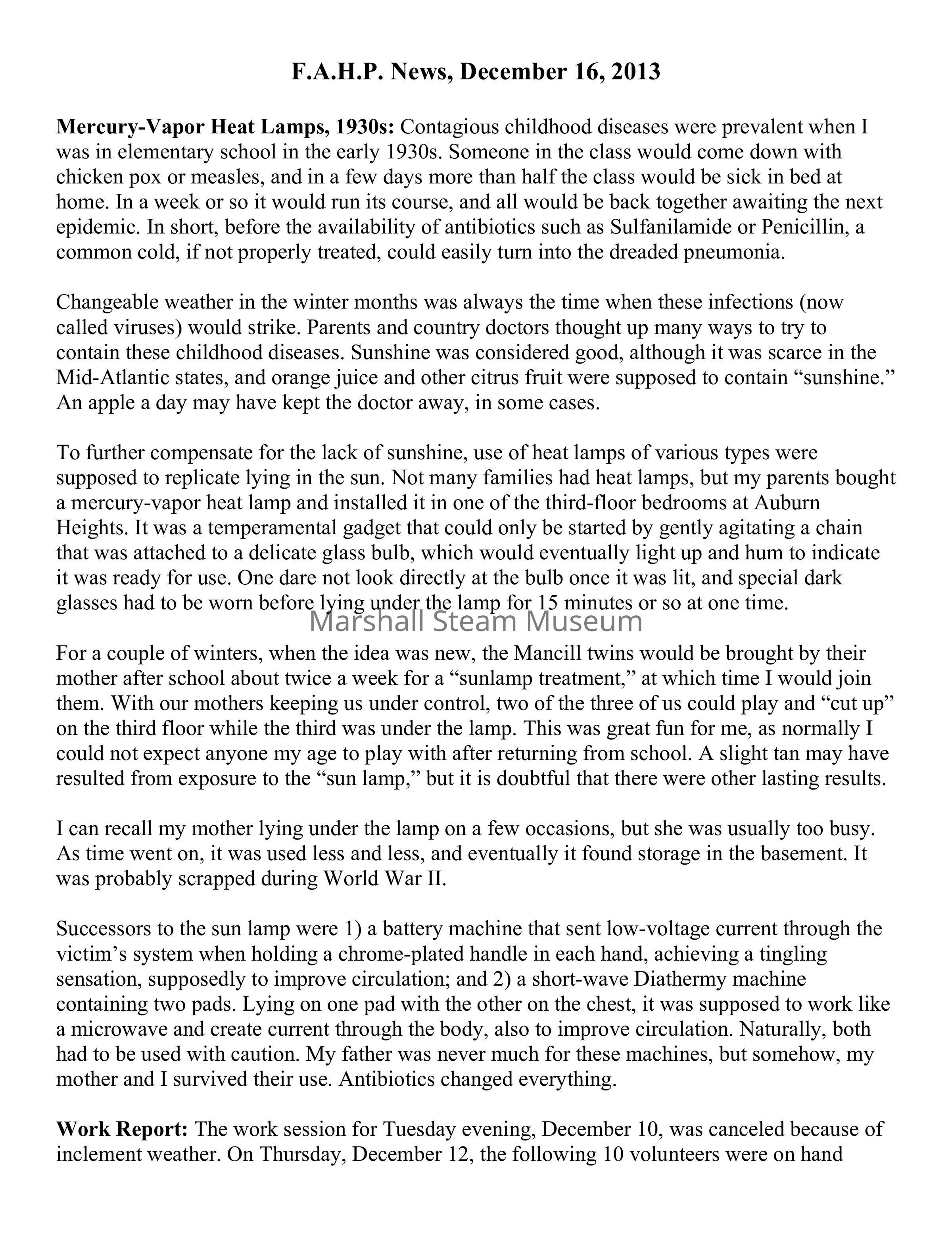 Mercury-Vapor Heat Lamps, 1930s: Contagious childhood diseases were prevalent when I was in elementary school in the early 1930s. Someone in the class would come down with chicken pox or measles, and in a few days more than half the class would be sick in bed at home. In a week or so it would run its course, and all would be back together awaiting the next epidemic. In short, before the availability of antibiotics such as Sulfanilamide or Penicillin, a common cold, if not properly treated, could easily turn into the dreaded pneumonia.